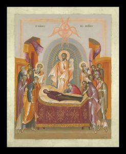 Μετά τον θάνατο η ψυχή Της ενώνεται αμέσως με τον Χριστό. Διότι ο Κύριος κατά την ώρα της Κοιμήσεως της Μητέρας Του συνοδευόμενος από τα υπερκόσμια τάγματα των αγγέλων και αγίων παίρνει την ιερά ψυχή Της όχι απλώς στον ουρανό, αλλά «έως αυτού του βασιλικού θρόνου Του, εις τα επουράνια Άγια των Αγίων», όπως αναφέρει ο άγιος Ιωάννης ο Δαμασκηνός.Ενώ το ζωαρχικό και θεοδόχο σώμα της Παναγίας μετά από τρεις ημέρες μετατίθεται στους υπερουρανίους χώρους, άφθαρτο, προς τον Μονογενή και αγαπημένο Υιό Της.