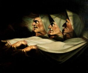 Ας δούμε λοιπόν πώς παρουσιάζονται οι μάγισσες-μοίρες στις λίγες εμφανίσεις τους στο έργο. Ο Σαίξπηρ, ξεκάθαρα επηρεασμένος από το αρχαίο ελληνικό δράμα, τις βάζει να παίζουν τον ρόλο του χορού, που αφηγείται τι πρόκειται να συμβεί και σχολιάζει τα τεκταινόμενα. Που, ως θεμελιώδες συστατικό του δράματος, αντανακλά στον ρόλο του την κοινότητα απ’ όπου εκπορεύεται. Με δυο λόγια, με την ανώτερη γνώση και αντίληψη που ο χορός διαθέτει, αποτελεί καθρέφτη της κοινότητας και του χαρακτήρα με τον οποίο συνομιλεί.