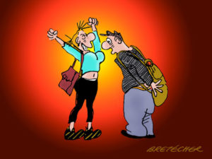 Η Μπρετεσέ ανήκει στις πρωτοπόρους της εποχής αυτής. Πέτυχε το απίστευτο: εισέβαλλε σε ένα καθαρά ανδρικό επάγγελμα. Και μπήκε εκεί με τους δικούς της όρους, επιβάλλοντας το δικό της στυλ. Έναν τόνο αντισυμβατικό, εκκεντρικό. Άφησε το σημάδι της με ένα σκίτσο τολμηρό, που δεν έχει την παραμικρή διάθεση ωραιοποίησης, με ένα λόγο καθημερινό, πολύ κοντά στη γλώσσα του δρόμου, του ανθρώπου της καθημερινότητας και των εφήβων, διακωμωδώντας την ξύλινη γλώσσα και τα στερεότυπα. Χωρίς να περιορίζεται ούτε καν από το συννεφάκι κειμένου, με τα πλάγια γράμματα που μοιάζουν να ακολουθούν, να σχολιάζουν, να υπογραμμίζουν τα κουλουριασμένα, παραιτημένα σώματα των αντιηρώων της, που τσαντίζονται παλεύοντας με τον αέρα περιορισμένοι από τη ζωή και το σαλόνι τους, που βυθίζονται, καταπίνονται από τους καναπέδες, που ζηλεύουν και πετάνε χολή, που ερωτεύονται και κάνουν γκάφες. Είναι άνθρωποι καθημερινοί που προσπαθούν να βγάλουν την ημέρα γκρινιάζοντας ακατάπαυστα και χωρίς ιδιαίτερο λόγο – τελικά όμως με λόγο πολύ ιδιαίτερο.