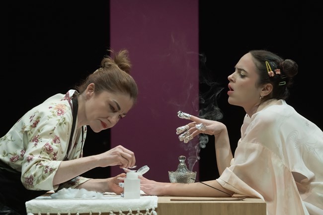 Ο χώρος θυμίζει γιαπωνέζικο σαλόνι, λιτό, με υπερυψωμένον στο κέντρο, σαν βωμό, ένα κώνο, όπου δυο κοπέλες, θα σταθούν αντικριστά, η Αργυρώ και η Κάλλια, και η μία θα προσπαθήσει να εκμαιεύσει τα μυστικά της άλλης, με αφορμή την περιποίηση των νυχιών. Τα νύχια είναι η πλέον αμελητέα, ίσως, λεπτομέρεια σε ένα σώμα που κρύβεται κάτω από διάφορα, εν είδει, κιμονό ρούχα. Όμως, κανένα ρούχο δεν μπορεί να κρύψει το πάθος που δεν μπορεί να ομολογηθεί. Όπως και το βερνίκι δεν μπορεί να κρύψει τη βαθιά ρωγμή στο νύχι, σαν δείγμα της άλλης, της ψυχικής.