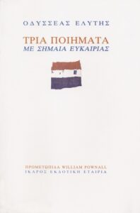 Όταν ήρθε η ώρα κι ο καιρός, μας ζήτησε, όποιος θέλει, να αναλάβει εργασία. Πλησίασα τρέμοντας στην έδρα και είπα: Ελύτη, Προσανατολισμούς θα ήθελα, αλλά εκείνος, χωρίς να ακούσει τι ήθελα, μου είπε με την μπάσα φωνή του: «Δεν μας κάνεις αυτό το καινούριο που βγήκε τώρα, Τρία Ποιήματα με Σημαία Ευκαιρίας, που δεν το έχει πιάσει κανείς. Εσύ τα πιάνεις κάτι τέτοια». Τρόμαξα και χάρηκα συγχρόνως. «Η καλύτερη εργασία», είπε «θα δημοσιευτεί σε ένα περιοδικό της Σχολής», δεν θυμάμαι τίτλο. Έτρεμα από λαχτάρα, πρώτον γιατί το νέο βιβλίο ήθελα να μελετήσω και όχι τους Προσανατολισμούς αλλά φοβόμουν το άγνωστο και ντρεπόμουν για την αλαζονεία μου… Εκείνος είπε, από τα Τρία Ποιήματα να μελετήσω το ένα. Εγώ μελέτησα και τα τρία. Δηλαδή και τα Τρία μέρη με εφτά ποιήματα το καθένα, σύνολο είκοσι ένα ποιήματα, ολόκληρη η συλλογή.