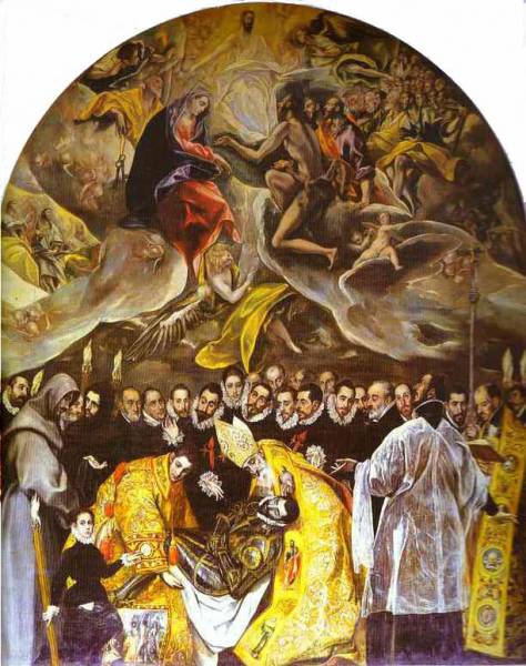 Ο πίνακας του Θεοτοκόπουλου Η ταφή του κόμητος Οργκάθ, είναι μοιρασμένος σε τρία επίπεδα. Στο πρώτο και ρεαλιστικό, κάτω μέρος του πίνακα μας δίνει την ταφή. Στο δεύτερο, το θρησκευτικό και μεταφυσικό, την ψυχή που σαν μωρό αγωνίζεται να περάσει τις «συμπληγάδες». Στο τρίτο επίπεδο, πάνω, ψηλά, είναι το φθάσιμο στα πόδια του Χριστού· η κορυφή, η καταξίωση.