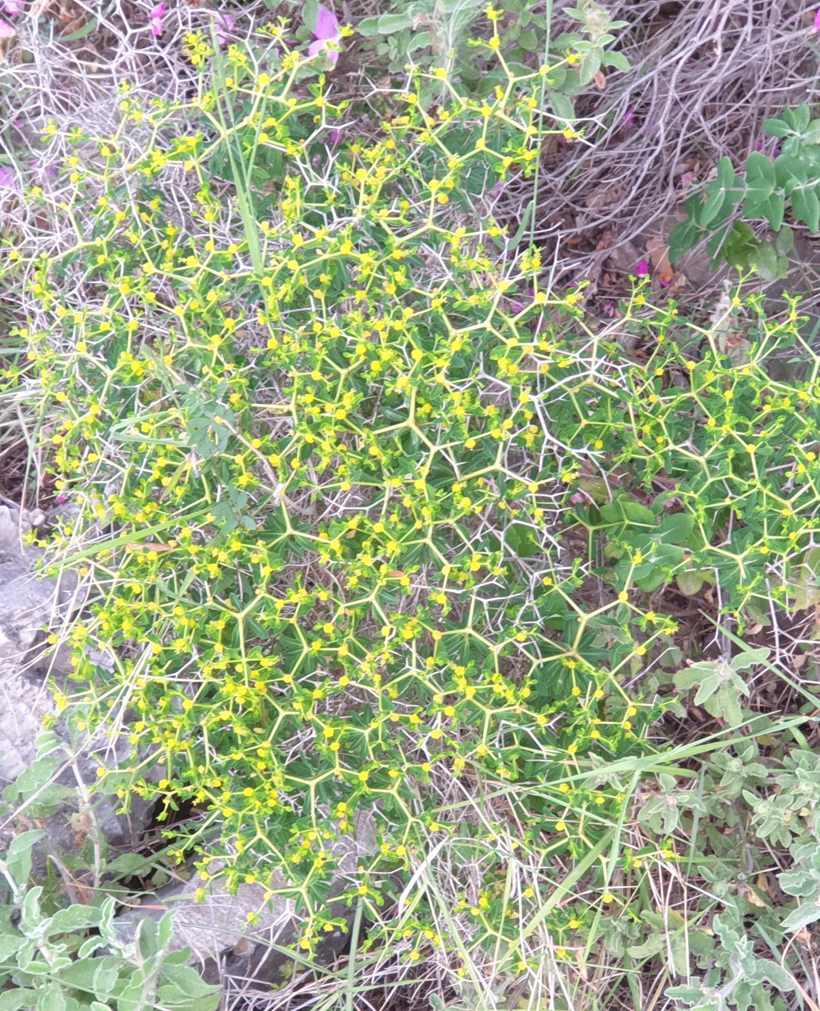 Μέσα στον ακανθόφραχτο θόλο, απλώνεται απαλό το κίτρινο λουλούδι του ασπάλαθου. Ασπίδα τρομερή κι απροσπέλαστη τα αγκάθια του πλεγμένα σε συμμετρικά ρομβοειδή εξάγωνα. Απόλυτα γεωμετρικά, τακτοποιημένα ώστε να προκαλούν σωστά μετρημένη οδύνη, ακριβοδίκαια μοιρασμένη εκδίκηση, ίσης αξίας πόνο και σταθμισμένο νυγμό. Από μέσα το κίτρινο λουλούδι, το απαλό πράσινο φύλο, σωστά προστατευμένο από τον ακάνθινο φλοιό, ακριβώς όπως θα θέλαμε να είναι οι αισθήσεις μας και το ευάλωτο είναι μας. Αισθήσεις σωστά φυλαγμένες κι απρόσιτες, ανέγγιχτες, άθιχτες στα γυρίσματα των καιρών, δυσαπόκτητες από τα αρπαχτικά τυραννικά χέρια των εκάστοτε Αρδιαίων. Κρυμμένες αισθήσεις καραδοκούν κάτω από το πλέγμα της άμυνας και της απλησίαστης προσμονής. Φυλάνε ζηλωτικά και περιφράζουν ακάνθινα τους πόθους και τις επιθυμίες στις δύσβατες ατραπούς του νου που κυριαρχεί στις ευνόητες αισθήσεις. Λίγα απομεινάρια μέσα στο ακάνθινο πλέγμα. Σωστά ζυγιασμένα πράσινα φύλα και κίτρινα λουλούδια μέσα στην ακάνθινη φυλακή τους. Προστατευμένες αισθήσεις απλωμένες στη ράχη του βουνού.