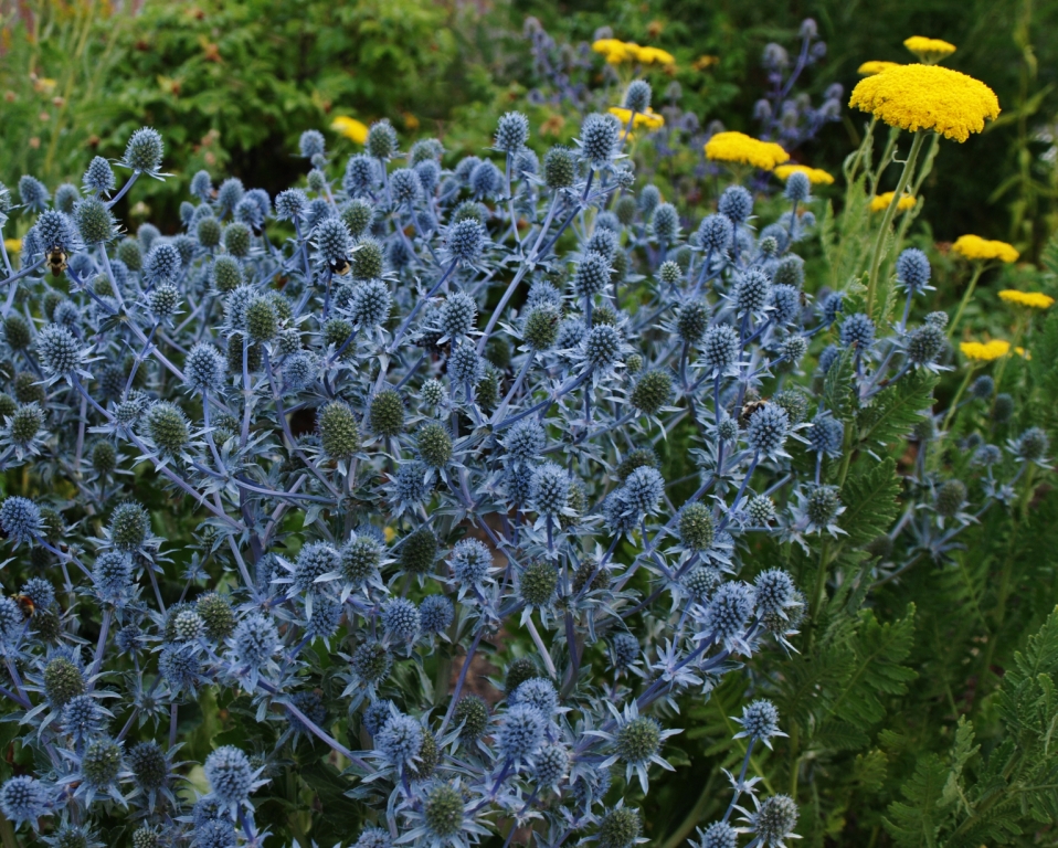 Στολίδι στο σιάδι του ελαιώνα μέσα στην αρχή του καλοκαιριού, στέκει το μπλε αγκάθι με τα αστεροειδή άνθη, άκαμπτο σαν την αιχμή του ανθού του. Απειλεί με την ομορφιά του και το απόκοσμο μπλε του χρώμα την ειρήνη των φύλλων της ελιάς. Ο τριγμός του στο αεράκι, σα φίδι που συρίζει με μια ηχώ ξεραΐλας και αποθυμιάς ταυτόχρονα. Εξωκοσμικό μπλε που ιριδίζει και παγώνει τις αισθήσεις που καραδοκούν να εκτιναχθούν. Που απωθεί και μαγνητίζει ταυτόχρονα. Μοιάζει να είναι η αντίθεση στη σιγουριά της ελιάς με τη δική του κρυφή έχθρα που καραδοκεί να πονέσει τις αλλοπαρμένες αισθήσεις που γυρεύουν τη λύτρωση μέσα από την έκρηξη του καλοκαιρινού ήλιου. Το μοσχάγκαθο, ξεκινά τη ζωή του χλωρό και γκριζοπράσινο και προχωρώντας το καλοκαίρι γίνεται γκρίζο μπλε και τον Αύγουστο πια θα δώσει τα άνθη του. «Της αγάπης το βοτάνι», το είπαν στην Ήπειρο, ίσως αγκαθωτό σαν την αγάπη κι απόκοσμο σαν τη φευγαλέα ευτυχία που υπόσχονται οι αισθήσεις.