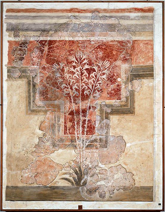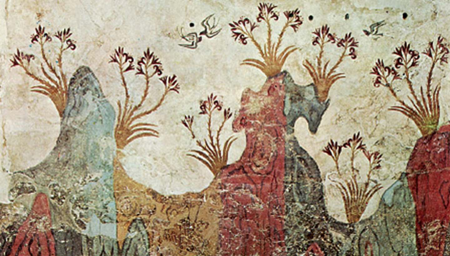 [3] Τοιχογραφία των κρίνων ή της άνοιξης. Τέλη Μεσοκυκλαδικής περιόδου, π. 1650 π.Χ. Θήρα, Ακρωτήρι(συγκρότημα Δ,δωμάτιο Δ2). Διαστάσεις 250 x260 εκ. Αθήνα, Εθνικό Αρχαιολογικό Μουσείο.