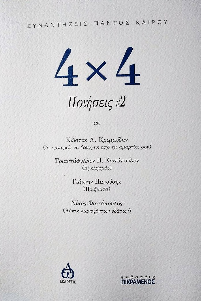 Το ποιητικό βιβλίο, «4χ4», εκδόσεις Πικραμένος, 2021, αφορά σε ένα συλλογικό πόνημα τεσσάρων σύγχρονων ποιητών, του εκδότη Κώστα Κρεμμύδα, και τριών πανεπιστημιακών, του Τριαντάφυλλου Κωτόπουλου, του Γιάννη Πανούση και του Νίκου Φωτόπουλου. Το παρόν κείμενο αφορά στην επί μέρους ποιητική συλλογή «Εγκλησμός / “4χ4″» του Τριαντάφυλλου Κωτόπουλου, Καθηγητή Δημιουργικής Γραφής και Νεοελληνικής Λογοτεχνίας του Πανεπιστημίου Δυτικής Μακεδονίας, που μαζί με τον αείμνηστο ποιητή και πανεπιστημιακό δάσκαλο Μίμη Σουλιώτη εδραίωσαν τον θεσμό και τις δομές της δημιουργικής γραφής στην Ελληνική Τριτοβάθμια Εκπαίδευση.