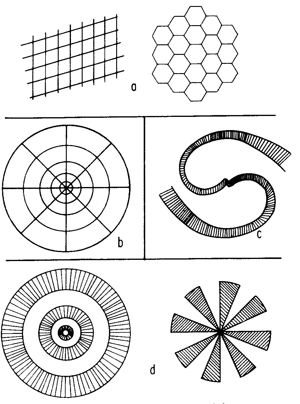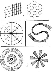 < Σχήμα 1. a Τυπικό δικτυωτό, b Ιστός αράχνης, c Σπιράλ, d Τούνελ και χωνί >