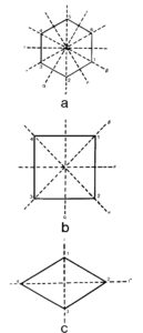 Σχήμα 2. Βασικές ομάδες συμμετρίας. a Εξαγωνική, b Τετραγωνική, c Ρομβική >