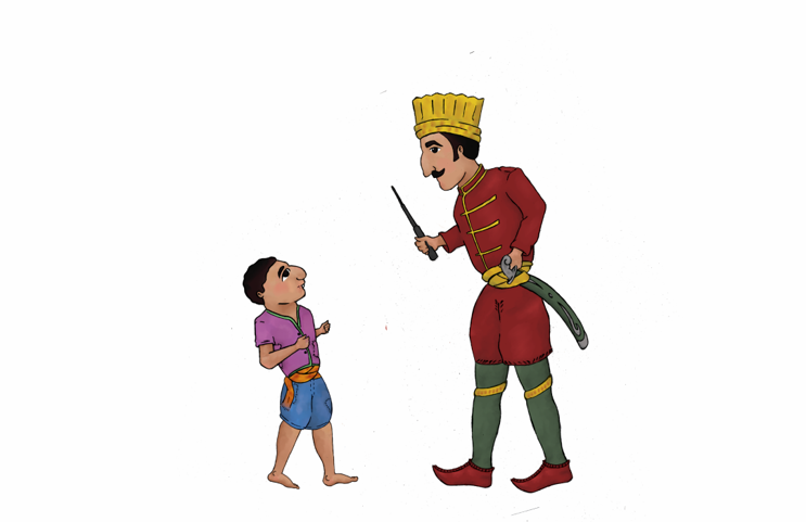 ΚΑΔΗΣ (προσκυνώντας): Πολυχρονεμένε μου Πασά, να πως έχουν τα πράγματα. Ήρθε από δώ ο φορατζής μαζί με τον τελάλη και τον τζιαντουρμά να εισπράξουν το καινούργιο χαράτσι για την προίκα της βασιλοπούλας κι αυτός ο μπελαλής ραγιάς αντί να πλερώσει, χάλασε τον κόσμο με τις φωνές του.