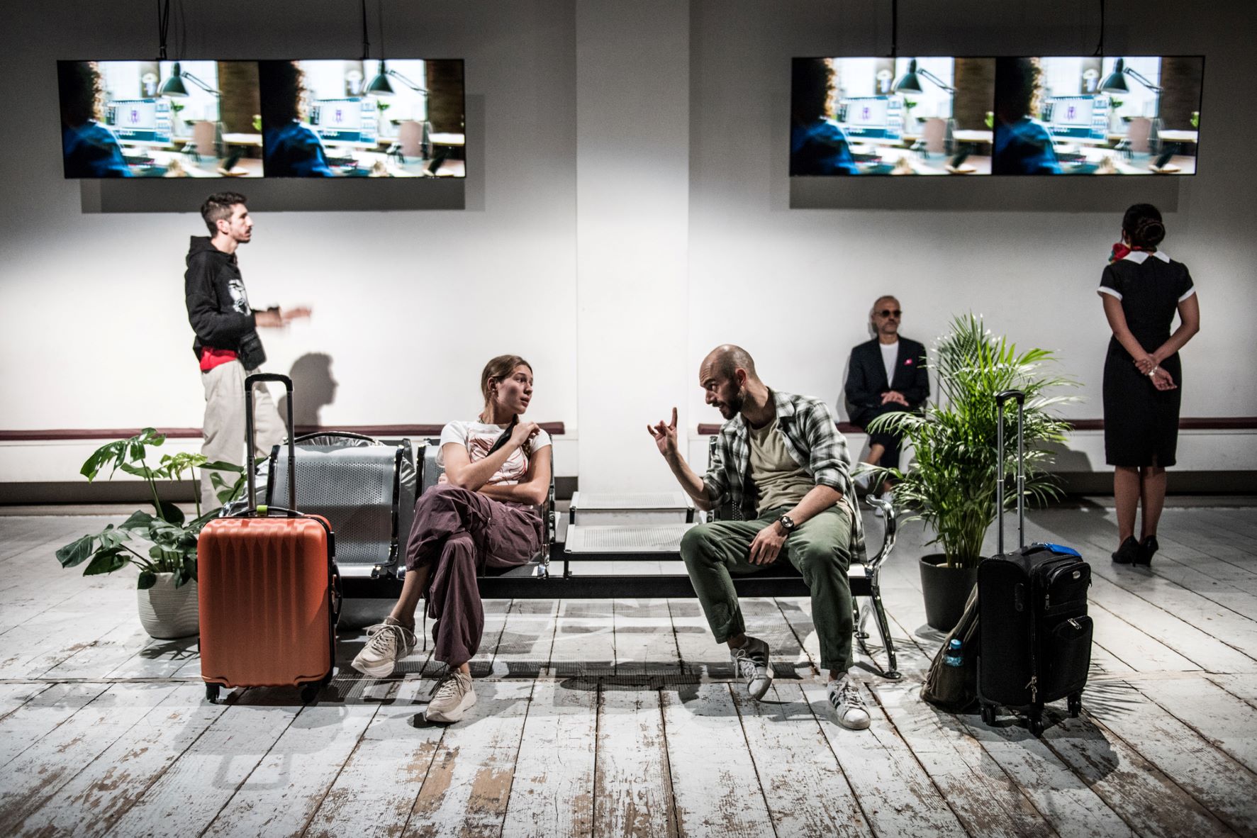 Καλύτερα δεν θα μπορούσε να το δείξει κανείς επί σκηνής: οθόνες που δείχνουν ειδήσεις με βιβλικές καταστροφές, άνθρωποι που παίζουν με τα κινητά τους σε έναν θάλαμο αναμονής αεροπορικής εταιρείας, παραληρούν, γυμνάζονται, καμώνονται πως επικοινωνούν, αγωνιούν όμως όλες και όλοι μαζί, μέχρι την τελική διονυσιακή υπέρβαση των εγώ, έως ότου δημιουργηθεί η συνείδηση τού εμείς, υπεύθυνου για τις επιμέρους και τις ομαδικές επιλογές μας.