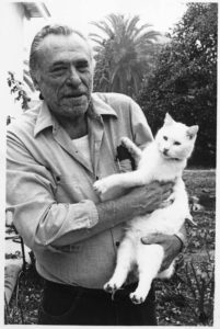 Τελευταίο, αλλά προς Θεού, όχι έσχατο, αφήσαμε τον Μπουκόφσκι με την Ιστορία του σκληρού μπαγάσα του (βλ. στο περσινό γατο-αφιέρωμα του περιοδικού μας, Η ιστορία του σκληρού μπαγάσα, σε δική μου μτφρ). Στη χώρα τούτη των γατών, ο κατατσακισμένος και αλλήθωρος γάτος του Τσαρλς κυριαρχεί, αποτελεί σύμβολο στον γατόκοσμο, αλλά και στο σύμπαν των δόλιων των ανθρώπων – δεν θα το κρύψουμε βεβαίως – έμβλημα, λέμε, αντοχής κι επιμονής στην επιλογής της ζωής, και δη της ευζωίας. Ενσάρκωση της αλήτικης αριστοκρατίας. Όπως κάθε σωστή γάτα.