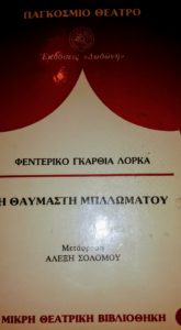 Το έργο του Λόρκα, “Η θαυμαστή μπαλωματού” («La zapatera prodigiosa»), που γράφτηκε το 1930, πρωτοπαρουσιάστηκε στις 24 του Δεκέμβρη του ίδιου χρόνου στο «Teatro Espanol» της Μαδρίτης, με το θίασο της Margarita Xirgou. Το 1935, και ενώ η Δημοκρατία θριαμβεύει στην Ισπανία, το έργο ανεβαίνει στο Conseum της Μαδρίτης με την Lola Membrives και σε σκηνοθεσία του ίδιου του Λόρκα. Στην Ελλάδα ανέβηκε πρώτη φορά το 1958 από το Εθνικό Θέατρο με τη Μαίρη Αρώνη στον ομώνυμο ρόλο και συνεχίζει να παίζεται από διάφορους θιάσους ως σήμερα.