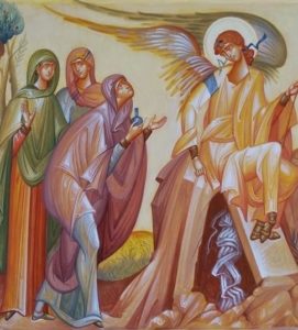 Και αργά τη νύχτα το Σάββατο, ενώ φώτιζε η πρώτη ημέρα μετά το Σάββατο, ήρθε η Μαριάμ η Μαγδαληνή και η άλλη Μαρία, για να δουν τον τάφο. Και ιδού, έγινε σεισμός μεγάλος. Γιατί άγγελος Κυρίου, αφού κατέβηκε από τον ουρανό και πλησίασε, κύλησε μακριά το λίθο και καθόταν πάνω του. Και ήταν η όψη του σαν αστραπή και το ένδυμά του λευκό σαν χιόνι. Και από το φόβο του ταράχτηκαν οι φύλακες και έγιναν σαν νεκροί. Έλαβε το λόγο τότε ο άγγελος και είπε στις γυναίκες: «Μη φοβάστε εσείς, γιατί ξέρω ότι ζητάτε τον Ιησού το σταυρωμένο.