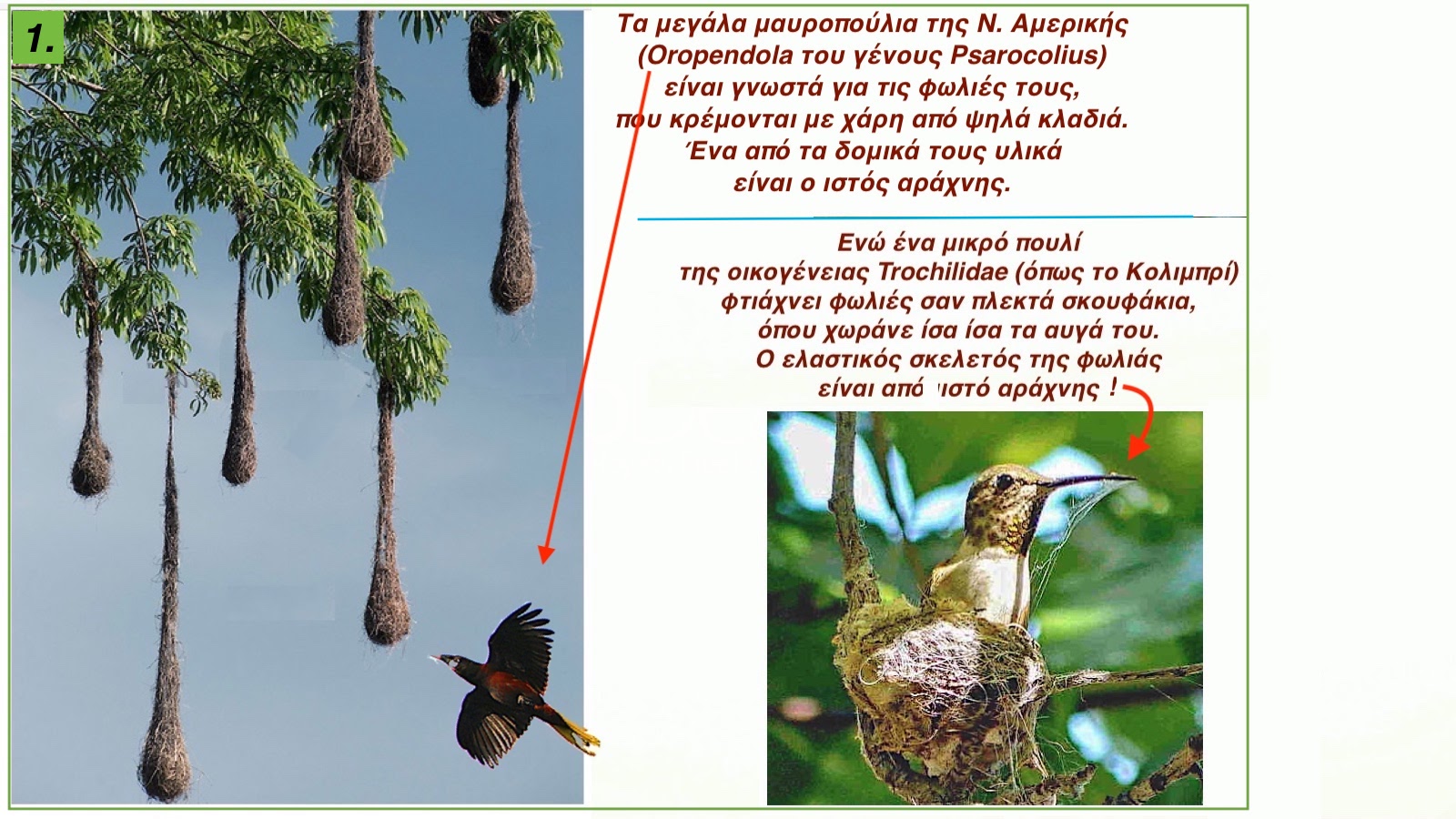 Το μεταξένιο νήμα που εκκρίνουν τα περισσότερα είδη της ομοταξίας Αραχνίδια και με το οποίο πλέκουν τις δαντέλες τους, έχει συνήθως διάμετρο από 25 ως 70 μμ. Λένε ότι είναι ανθεκτικότερο από το ατσάλινο νήμα αντίστοιχης διαμέτρου και 10 φορές πιο ελαστικό από το λατέξ. Αυτό σημαίνει ότι ο ιστός της αράχνης, εκτός από τις γνωστές του λειτουργίες και την αναντίρρητη ομορφιά του, είναι ένα υλικό με αξιοθαύμαστες ιδιότητες, που θα μπορούσε να έχει πολλές χρήσεις. Μερικά πουλιά ξέρουν να το αξιοποιούν με τον καλύτερο τρόπο.