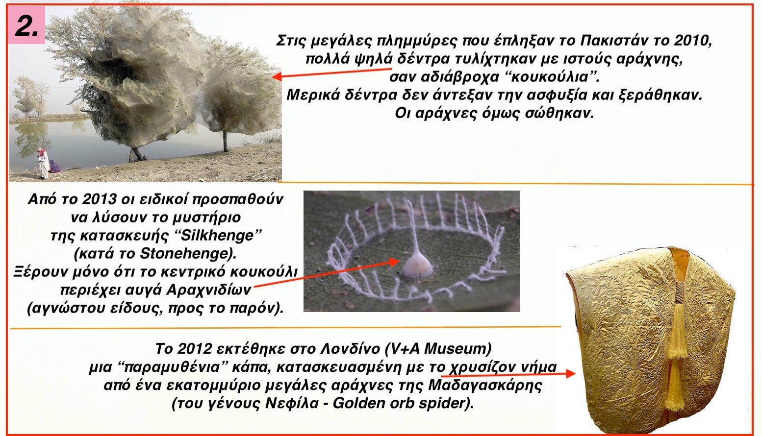 Υπάρχουν όμως και πιο ασυνήθιστες χρήσεις του ιστού, από τις ίδιες τις αράχνες – και όχι μόνο. Όταν βλέπουμε μεγάλες επιφάνειες ή αντικείμενα καλυμμένα με πυκνούς ιστούς, λογικά υποψιαζόμαστε ότι το ζητούμενο είναι η προστασία (η «μόνωση») του χώρου, κυρίως σε περιπτώσεις μεγάλης υγρασίας ή ακραίων θερμοκρασιών. Όταν όμως βλέπουμε κατασκευές σαν το μυστηριώδες “Silkhenge” του Αμαζονίου, σηκώνουμε τα χέρια ψηλά.