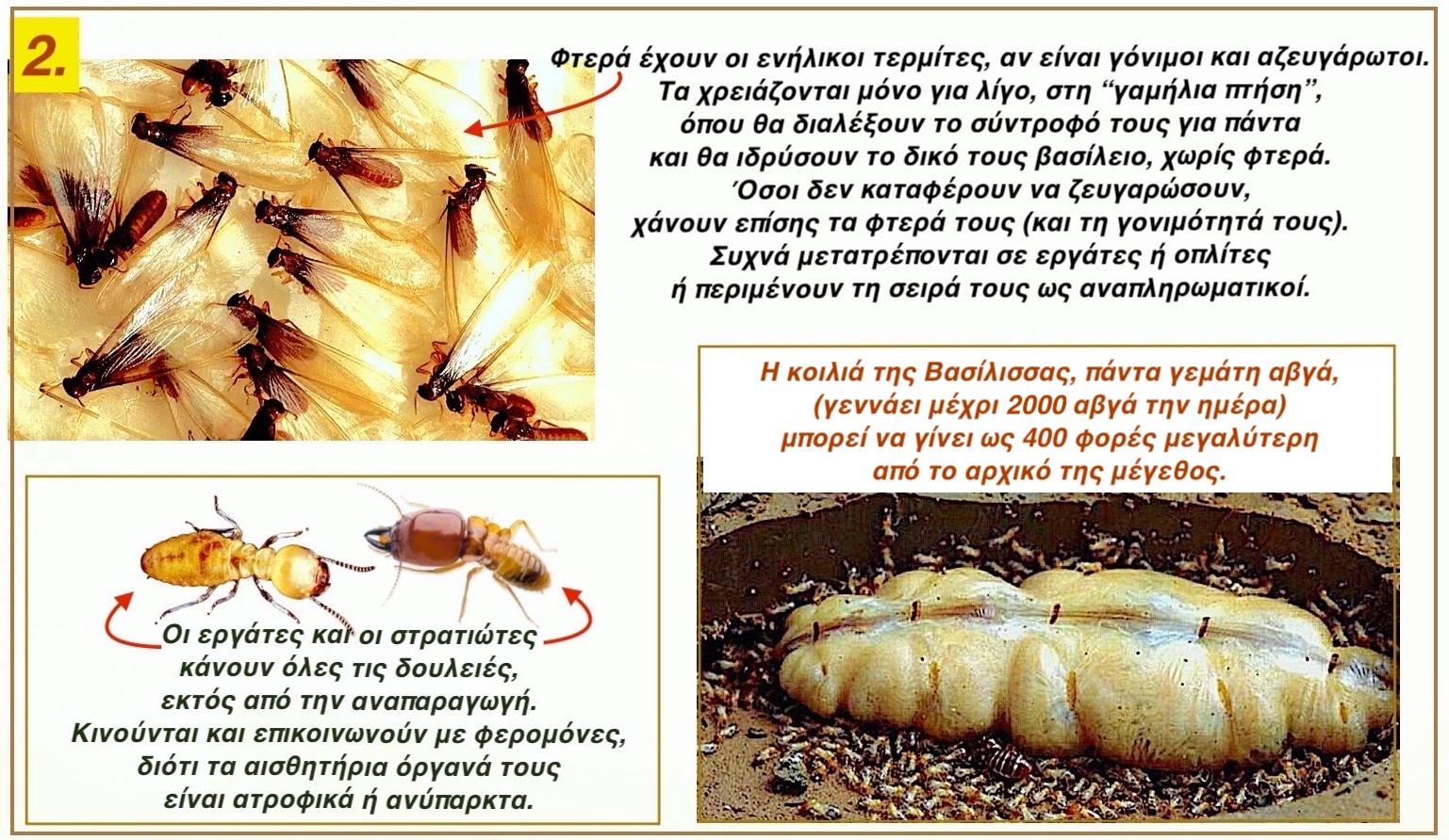 Εκτός από την πληθωρική Βασίλισσα, οι τερμίτες έχουν και Βασιλιά, μόνιμο και μονογαμικό, σε αντίθεση με τα περισσότερα «ευ-κοινωνικά» έντομα. Έχουν και μερικά αναπαραγωγικά άτομα (απενεργοποιημένα) για ώρα ανάγκης. Και έχουν, πάνω απ’ όλα, άφθονους εργάτες και πολεμιστές, άπτερους, άφυλους, στείρους, τυφλούς και αναλώσιμους, οι οποίοι όμως τρώνε (ξύλο) κανονικά, το χωνεύουν και το ταΐζουν χωνεμένο στους ανωτέρους τους, με στοματική ή πρωκτική τροφάλλαξη. Μόνον έτσι μπορούν να τραφούν οι ανώτερες κάστες, οι οποίες πάντως ζουν πολύ περισσότερα χρόνια από τους ταπεινούς εργάτες. Η δε Βασίλισσα δεν γερνάει ποτέ και μπορεί να ζήσει 10-20 φορές περισσότερο από τους υπηκόους της (δηλαδή από τα παιδιά της).
