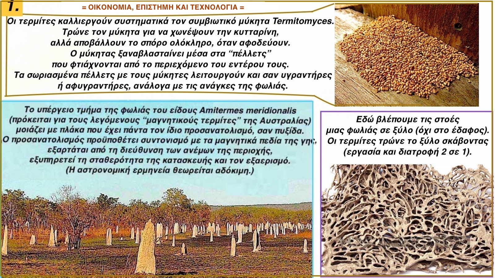 Οι τερμίτες είναι από τα πιο επιτυχημένα είδη του ζωικού βασιλείου. Η κοινωνία τους δεν μπορεί να χαρακτηριστεί παραδεισένια, αλλά λειτουργεί αποτελεσματικά. Θεωρούνται βλαβερά παράσιτα, αλλά παίζουν σπουδαίο ρόλο στη ισορροπία των δασικών οικοσυστημάτων. Οι εξωτερικές τους ομοιότητες με τα μυρμήγκια θα μας θυμίζουν πάντα την περιπέτεια της φυλογενετικής τους κατάταξης, μια περιπέτεια που έληξε (;) πολύ πρόσφατα. Αναφέρω συμπληρωματικά ότι τα μυρμήγκια είναι οι επιφανέστεροι θηρευτές των τερμιτών. Αποδεκατίζουν μετά μανίας ολόκληρες αποικίες, ενώ ο στρατός των τερμιτών παραδίδεται σχεδόν αμαχητί. Όλα αυτά, βεβαίως, αφήνουν εντελώς αδιάφορους τους μυρμηγκοφάγους, οι οποίοι τρώνε αδιακρίτως μυρμήγκια και τερμίτες, χωρίς να ενοχλούνται από ονοματολογικές ανακρίβειες.