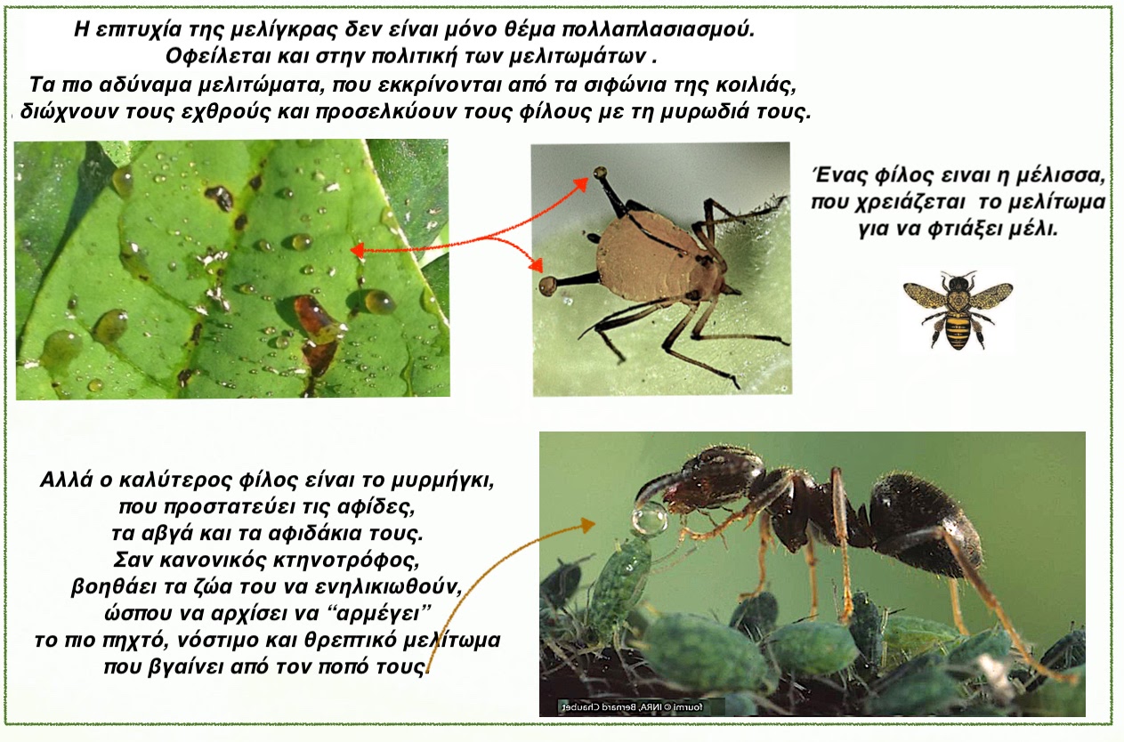 Τέλος πάντων, το ελληνικό όνομα της μελίγκρας δηλώνει το «μέλι με κερί», δηλαδή τα μελιτώματα, που εκκρίνονται από τα δύο «σιφώνια» της πλάτης της, αλλά και από την έξοδο του πεπτικού της σωλήνα σαν περιττώματα.