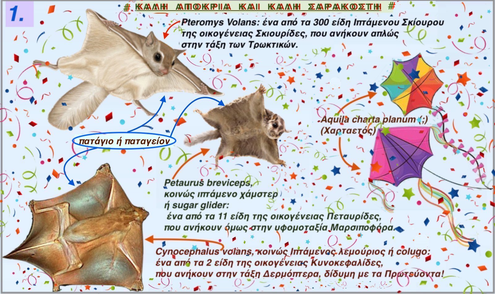 Τα δημοφιλέστερα άπτερα ιπτάμενα σπονδυλωτά διαθέτουν πτητικές μεμβράνες, τα λεγόμενα «πατάγια» (patagia), που ανοίγουν την κατάλληλη στιγμή και τους επιτρέπουν να διασχίζουν μέχρι και 200 μέτρα στον αέρα, πηδώντας από δέντρο σε δέντρο.