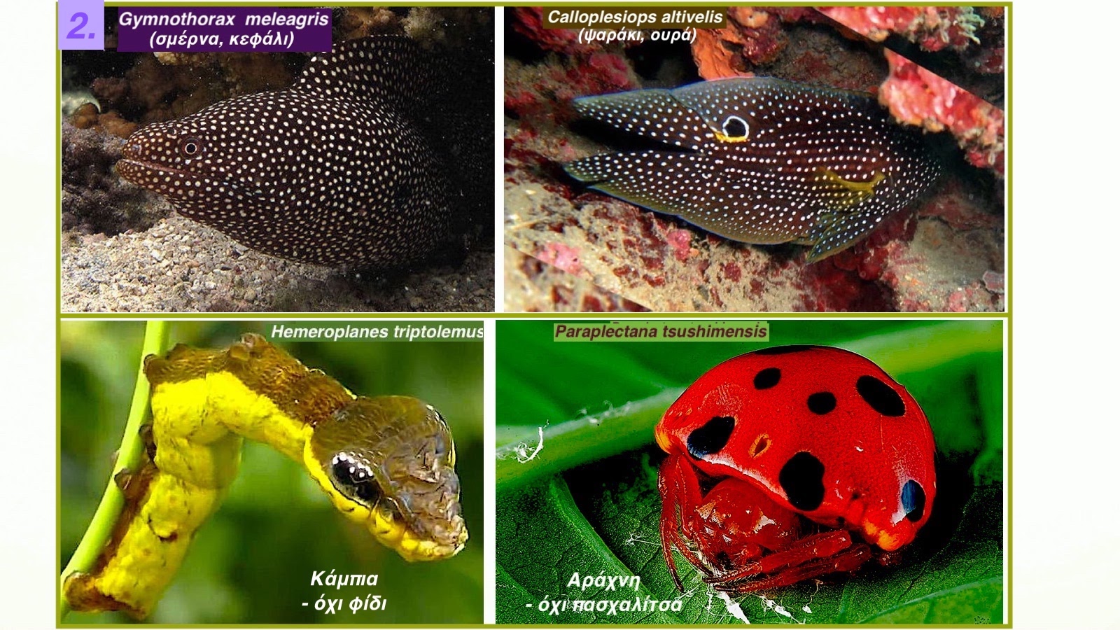 Οι συμπαθείς κόκκινες πασχαλίτσες (Coccinella septempunctata) έχουν υψηλή τοξικότητα, απαίσια γεύση και αηδιαστική μυρωδιά. Ξέρουμε ότι τα έντονα χρώματα δηλώνουν «ακατάλληλο προς βρώσιν», προστατεύοντας έτσι τους επίδοξους θηρευτές, αλλά και τα ίδια τα δηλητηριώδη ζώα. Πολλά αβλαβή ζωύφια και ερπετά «ντύνονται» με έντονα χρώματα, σαν να είχαν δηλητήριο, για να προστατευτούν. Ή, ποιος ξέρει, ίσως και για να κάνουν φιγούρα. Γι’ αυτό άλλωστε υπάρχουν τόσες εκδοχές καμουφλάζ. Δεν είναι μόνο θέμα επιβίωσης, είναι και θέμα στυλ, όπως ξέρουν πολύ καλά οι χαμαιλέοντες.