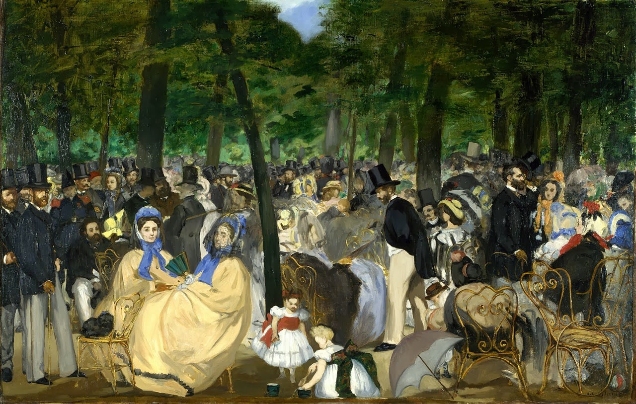 Στο έργο του τελευταίου: Μουσική στους κήπους του Κεραμικού, μια σειρά προσωπογραφιών που ξετυλίγεται από αριστερά προς τα δεξιά – όπως ακριβώς πρέπει ν’ αρχίζει κανείς – αποτύπωσε όλο το γνωστό σύγχρονό του ‘ζωικό βασίλειο’, την καλλιτεχνική και λογοτεχνική ιντελιγκέντσια της δεκαετίας του 1860 συμπεριλαμβάνοντας οικογένεια και φίλους. Αυτός στέκει μισός εντός, μισός εκτός των ορίων του πίνακα σαν παράδειγμα ενός περιθωριακού flaneur που είναι μέρος του κόσμου, αλλά συγχρόνως αντικειμενικός και αποστασιοποιημένος παρατηρητής του. Στον πίνακα που απεικονίζει έναν πότη του αψεντιού (1859), αποτυπώνει το σοβαρό πρόβλημα αλκοολισμού που ταλάνιζε τότε το Παρίσι. Μοντέλο του υπήρξε ένας απένταρος σουλατσαδόρος, ένας ρακοσυλλέκτης που ζούσε στη γειτονιά του. Ο πίνακας απορρίφθηκε, αλλά παρουσιάστηκε σ’ ένα επόμενο σαλόνι απορριφθέντων έργων.