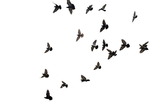 Flocks of flying pigeons isolated on white background. Clipping path.