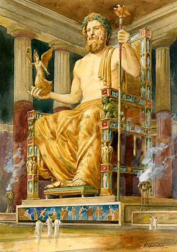 […] ήταν τόσο ψηλό (το άγαλμα) στο μέγεθος, ώστε παρά τις πολύ μεγάλες διαστάσεις του ναού,5 να φαίνεται ότι ο καλλιτέχνης απέτυχε στο θέμα της συμμετρίας· γιατί παριστάνοντας τον θεό καθισμένο και να αγγίζει σχεδόν με το κεφάλι την οροφή του οικοδομήματος, τον έκανε να δίνει την εντύπωση ότι, αν σηκωνόταν όρθιος, θα αφαιρούσε τη στέγη του ναού.6 […] Πολλά προσέφερε στον Φειδία η βοήθεια του ζωγράφου Παναίνου, ο οποίος ήταν ανεψιός του και συνεργάτης του στη διακόσμηση του αγάλματος με χρώματα, προπάντων του ενδύματος. […] Διηγούνται, δε, για τον Φειδία ότι, όταν ρωτήθηκε από τον Πάναινο βάσει ποιου προτύπου σκοπεύει να δημιουργήσει τη μορφή του Δία, είπε πως θα το κάνει βάσει της εικόνας που έδωσε ο ΄Ομηρος με τούτα τα λόγια: