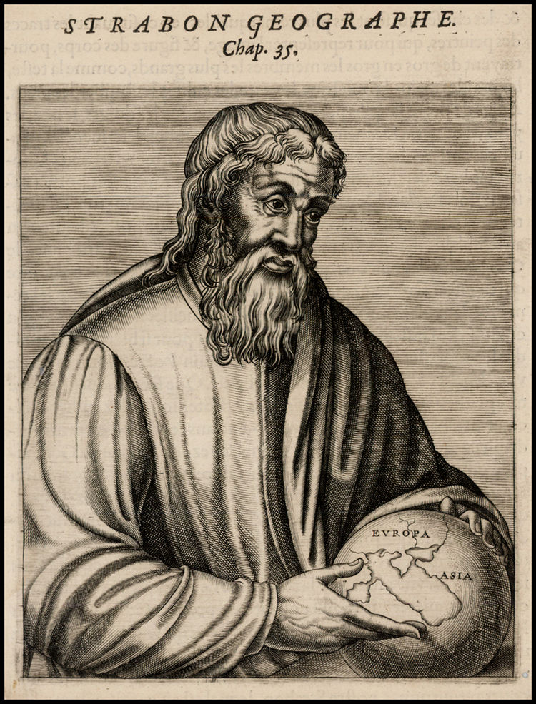 1) Ιστορικός και σπουδαίος γεωγράφος της αρχαιότητας (66 π. Χ.-24 μ. Χ.). Γεννήθηκε στην Αμάσεια του Πόντου και είχε ευγενική καταγωγή. Το 44 π. Χ. πήγε στη Ρώμη, όπου παρακολούθησε τα μαθήματα του Στωικού φιλοσόφου Ποσειδωνίου — ο ίδιος ήταν περήφανος όχι ως ιστορικός ούτε ως γεωγράφος, αλλά ως φιλόσοφος — για κάποιο διάστημα, δε, διέμεινε και στην Αλεξάνδρεια. Ο Στράβων ταξίδεψε πολύ, περισσότερο από κάθε άλλον προηγούμενο γεωγράφο· από την Αρμενία μέχρι την Τυρρηνία, όπως λέει, και από τον Εύξεινο Πόντο μέχρι τα σύνορα της Αιθιοπίας.