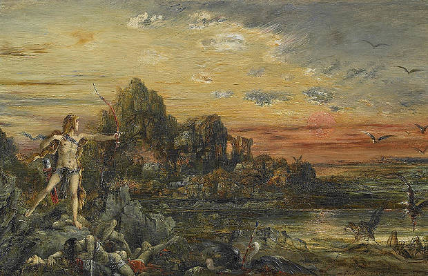 Οι μελετητές του έργου του έχουν επισημάνει μερικούς πίνακες του GustaveMoreau, που έχουν ιστορικό ή μυθολογικό θέμα και των οποίων η επίδραση είναι αρκετά εμφανής στα ποιήματα του Ερεντιά με παρεμφερές θέμα. Έτσι, η ατμόσφαιρα που μας δίνεται στο πρώτο τετράστιχο του σονέτου για τη λίμνη της Στυμφαλίας έχει ομοιότητες με το σπήλαιο και τα έλη που έχει ζωγραφίσει ο Μoreauστον πίνακά του με το ίδιο μυθολογικό θέμα. Υπάρχουν βέβαια και διαφορές. Ανάμεσα σε αυτές είναι και δυο που είναι βασικές. Η μία είναι ότι ο Ηρακλής του ζωγράφου είναι όρθιος στην αριστερή πλευρά του πίνακα και σημαδεύει τα πουλιά που είναι σε ένα πιο χαμηλό επίπεδο απ’ αυτόν, ενώ στο σονέτο του Ερεντιά ο μυθικός ήρωας έχει πάνω απ’ το κεφάλι του ένα σύννεφο από πουλιά, που τον αναγκάζει να σημαδεύει ψηλά προς τον ουρανό με το τόξο του για να τα χτυπήσει. Η άλλη βασική διαφορά είναι ότι ο ήλιος για τον οποίο γίνεται λόγος στο τελευταίο τρίστιχο του σονέτου, στον πίνακα του Moreauδεν υπάρχει. Θα ήταν όμως αδύνατο να μην υπήρχαν αυτές οι δυο διαφορές. Και το λέω αυτό γιατί αυτές οι διαφορές είναι που στηρίζουν την ιδέα που θέλει να εκφράσει το ποίημα. Από τον πέμπτο στίχο και μετά δεν υπάρχει τίποτα που να έχει σχέση με τον πίνακα του Moreau. Ό,τι διαβάζουμε από εκεί και πέρα είναι καθαρά έμπνευση του ποιητή. Και με αυτή την παρατήρηση, δεν θέλω να πω μόνο ότι απομακρύνεται από κάθε επίδραση του Moreau, αλλά και από κάθε απεικόνιση ή αφήγηση που έχουμε δει ή διαβάσει γι’ αυτό τον άθλο. Πράγματι, ούτε η αρχαία αγγειογραφία ούτε και η ευρωπαική ζωγραφική μάς έχουν παρουσιάσει εικαστικά αυτό τον άθλο όπως ο Ερεντιά στο σονέτο του. Αν προσέξουμε τους στίχους 9,10 και 11 της τρίτης στροφής, η περιγραφή της εξόντωσης των πουλιών δεν έχει το όμοιό της ούτε στη ζωγραφική ούτε στη λογοτεχνία. Καθώς ο Ηρακλής ρίχνει ασταμάτητα και γρήγορα τα βέλη του και πληγώνει θανάσιμα τα πουλιά, πέφτει από ψηλά “φριχτή βροχή”, “ pluiehorrible”, όπως λέει ο ποιητής στο πρωτότυπο. Αν και δεν εξηγεί ότι πρόκειται για το αίμα που στάζουν οι πληγές των πουλιών, ο αναγνώστης εύκολα το καταλαβαίνει, όταν στο τέλος του ποιήματος ο Ηρακλής – που έχει στο μεταξύ εξοντώσει τα φοβερά πουλιά και έχει λυτρώσει τον τόπο από ένα μεγάλο κακό – παρουσιάζεται να χαμογελάει στον μπλε ουρανό καταματωμένος από το αίμα των φονευθέντων πουλιών, “ toutsanglantsourireaugrandcielblue”, όπως λέει ο στίχος του ποιητή στο πρωτότυπο. Έναν τέτοιον Ηρακλή, είναι αλήθεια, καμία ζωγραφική δημιουργία δεν μας έδωσε , ούτε και ομότεχνος του Ερεντιά πριν απ’ αυτόν. Δεν είναι λοιπόν λίγο ότι αυτός ο Γάλλος ποιητής πήρε έναν πασίγνωστο και χιλιοειπωμένο μύθο και βρήκε την έμπνευση και την εκφραστική δύναμη να μας τον πει με έναν τρόπο που ποτέ άλλος κανείς δεν μας τον είχε ζωγραφίσει ή αφηγηθεί πριν.
