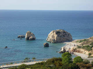 Κατεβαίνοντας από τα Κούκλια βρεθήκαμε στην περίφημη Πέτρα του Ρωμιού. Εκεί σύμφωνα με τον μύθο γεννήθηκε η Αφροδίτη, η θεά της ομορφιάς και του έρωτα. Είναι ένας τεράστιος βράχος που, σύμφωνα με την κυπριακή παράδοση, ο Διγενής, στα χρόνια των αραβικών επιδρομών στην Κύπρο, στην προσπάθειά του να αποτρέψει την απόβαση των Σαρακηνών στη συγκεκριμένη ακτή, άρπαξε έναν τεράστιο βράχο και τον εκσφενδόνισε εναντίον τους. Ψιθύρισα αμέσως τους στίχους: