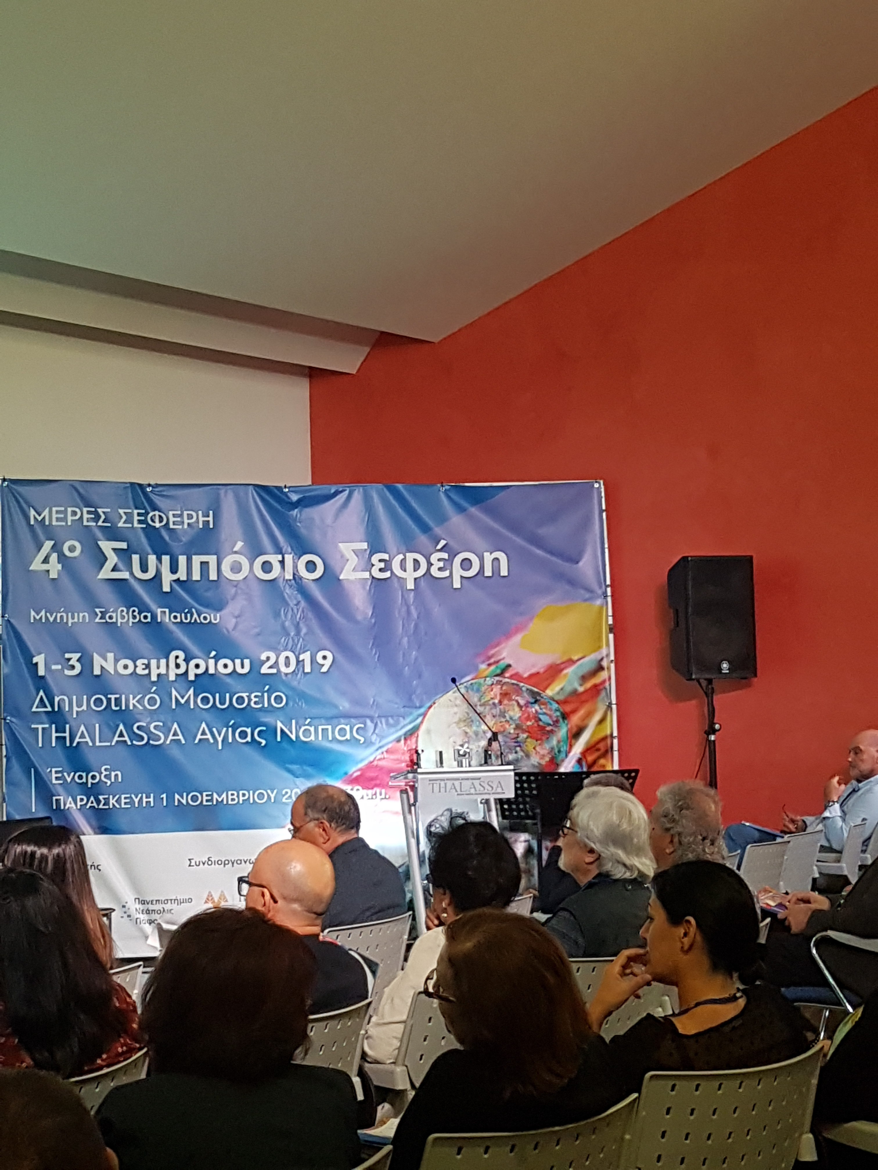 Το απόγευμα της Παρασκευής, 1 Νοεμβρίου 2019, κήρυξε την έναρξη των εργασιών του Συμποσίου ο Υπουργός Εξωτερικών κος Νίκος Χριστοδουλίδης, εφόσον το Συμπόσιο τελεί υπό την αιγίδα του Προέδρου της Δημοκρατίας της Κύπρου κο Νίκο Αναστασιάδη. Κι αφού ολοκληρώθηκαν οι σχετικοί χαιρετισμοί μεταξύ των οποίων του Γιάννη Καρούσου, Δημάρχου της Αγ. Νάπας, του Τάσου Χριστοφίδη, Πρύτανη του Πανεπιστημίου Κύπρου, Διομήδη Μαρκουλλή, αντιπρύτανη Πανεπιστημίου Νεάπολις Πάφου και Ιωάννη Μαλλικούρτη, Επιτετραμμένου της Ελληνικής Πρεσβείας στην Κύπρο το Μουσικό σχήμα Γιώργου Καλογήρου έπαιξε μελοποιημένα από τον ίδιο ποιήματα του Σεφέρη, όπως το Αγιάναπα Β’, την Ελένη, τη Σαλαμίνα της Κύπρος κ.ά.
