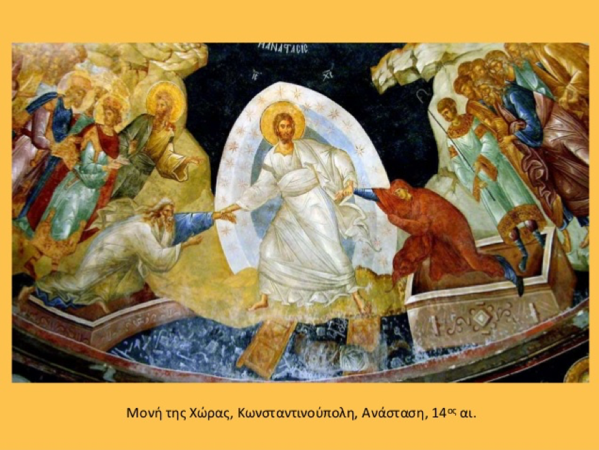 Φτάνοντας στο παρεκκλήσι βρέθηκα μπροστά στην πανέμορφη τοιχογραφία της «Αναστάσεως» του Χριστού. Είναι, κατά γενική αναγνώριση, η πλέον αριστουργηματική και συναρπαστική Ανάσταση στη βυζαντινή εικονογραφία κι εκφράζει τον θρίαμβο του Χριστού πάνω στον θάνατο. Στο κέντρο της, ανάμεσα σε δύο απότομους βράχους, προβάλλει έξαφνα ο Χριστός, εξερχόμενος νικητής από τον Άδη, κι αρπάζοντας με δύναμη, από το βασίλειο του θανάτου με το ένα χέρι τον Αδάμ και με το άλλο την Εύα, τους φέρνει στη ζωή. Αυτή τη δύναμη με την οποία κυριολεκτικά τραβά τους πρωτόπλαστους φανερώνει το ιμάτιό του που κυματίζει, ο μεγάλος διασκελισμός του, η πλάγια προς τα δεξιά κίνηση του κορμιού του, η κατά 45 μοίρες από το οριζόντιο επίπεδο κλίση των σωμάτων των πρωτοπλάστων, τα παραλυμένα χέρια τους. Τα ενδύματά του είναι αστραφτερά και ολόκληρος περιβάλλεται από φωτεινή «δόξα», που αποτελείται από ουράνιες σφαίρες στολισμένες με φωτεινά άστρα.