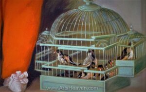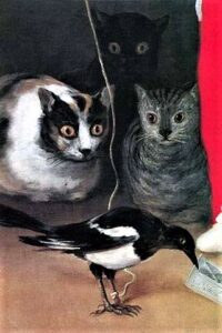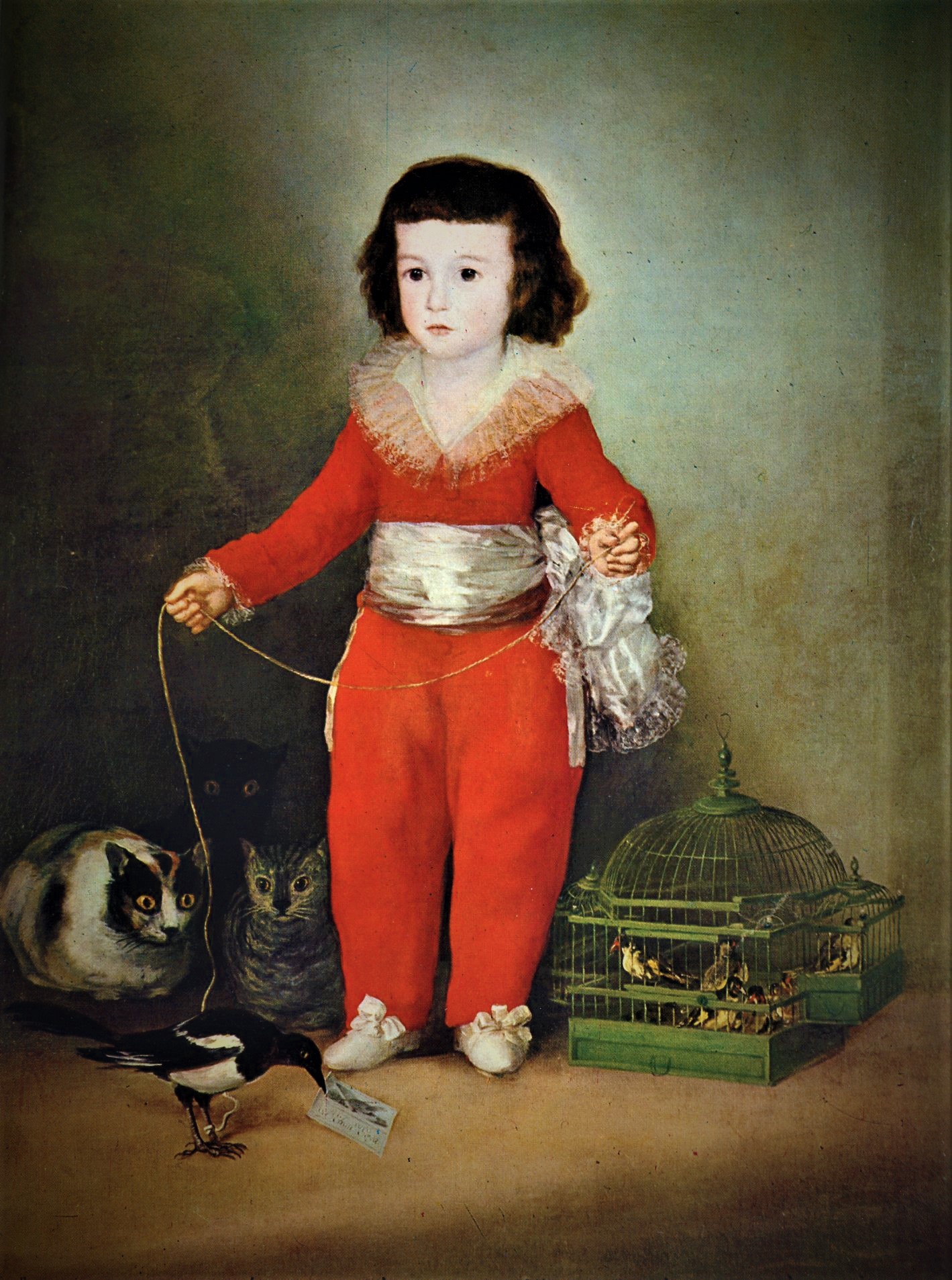 Ας πάρουμε για παράδειγμα τον πίνακα του απεικονίζει τον μικρό Manuel Osorio, γιο του κόμη και της κόμισσας της Αλταμίρα. Το αγοράκι, ντυμένο με λαμπρό κόκκινο κουστούμι, ποζάρει ανάμεσα σε ένα κλουβί με σπίνους και δύο γάτες που μοιάζουν σαγηνεμένες από την κίσσα που το παιδί κρατάει δεμένη με ένα σκοινάκι. Όμως μια στιγμή, για κοιτάχτε καλύτερα! Κρυμμένη πίσω στους ίσκιους διακρίνουμε και μια τρίτη γάτα. Και αίφνης συνειδητοποιούμε ότι ο πίνακας που κοιτάζουμε έχει και αυτός μάτια και μας παρακολουθεί… Όσο για την κίσσα, η ιδιοφυία του ζωγράφου, για να δικαιολογήσει λες την κλέφτρα φύση της, την βάζει να κρατάει στο ράμφος της μια κάρτα, ένα χαρτάκι με τη δική του υπογραφή.