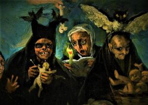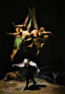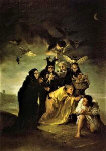 Ας προχωρήσουμε όμως χωρίς άλλη αναβολή στο κυρίως θέμα μας που είναι οι μάγισσες στα έργα του Φρανθίσκο ντε Γκόγια. Γνωρίζοντας το αιματηρό ιστορικό πλαίσιο της χώρας, την προσωπική ιστορία και την πολιτική τοποθέτηση του Γκόγια, οι ιστορικοί τέχνης καταλήγουν ότι οι σκοτεινοί πίνακες που ακολούθησαν την πρώτη «φωτεινή» νεανική περίοδο του ζωγράφου, σατιρίζουν, στηλιτεύουν, γελοιοποιούν ακόμα τη βίαιη και γεμάτη καταπίεση, άγνοια και υποκρισία πραγματικότητα της χώρας του.