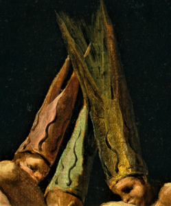 Σε ένα απόλυτα σκοτεινό τοπίο τρεις μάγισσες – μπορεί να είναι και μάγοι – μετεωρίζονται βαστώντας μεταξύ τους το γυμνό σώμα ενός ανθρώπου που έχει τα χέρια ανοιχτά και το κεφάλι ριγμένο πίσω σαν να υποφέρει. Η μία φαίνεται να δαγκώνει, ή να ρουφάει ίσως, τη θηλή του, οι άλλες δύο προχωρούν παρακάτω στο σώμα. Όλες είναι ημίγυμνες, φορούν όμως το μυτερό καπέλο της μάγισσας (coroza) που η Ιερά Εξέταση απαιτούσε να φορούν οι κατηγορούμενοι για μαγεία. Πάνω στα μυτερά καπέλα βλέπουμε ζωγραφισμένες φλόγες, σημάδι των αμετανόητων αιρετικών, των καταδικασμένων να καούν ζωντανοί στην πυρά. Ωστόσο ο προσεκτικός θεατής βλέπει ότι το καπέλο καταλήγει σε δύο αιχμές· όπως δηλαδή η μήτρα του επισκόπου. Το σημείο αυτό οδηγεί στο σαφές πλέον συμπέρασμα ότι οι πίνακες είναι καθαρά αλληγορικοί. Οι μάγισσες αποτελούν απλώς τους αποδιοπομπαίους τράγους, είναι ο τρόπος που η Καθολική Εκκλησία έχει επινοήσει για να διατηρεί και να ενισχύει τη δεισιδαιμονία και, καταστροφολογώντας, να ενισχύει και να εκμεταλλεύεται τους φόβους και τις προλήψεις του αγράμματου λαού.