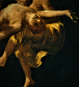 Τα στοιχεία που περιβάλλουν το κεντρικό θέμα υπογραμμίζουν την αλληγορία. Στο φόντο ουρανός κατάμαυρος, στέρφα γη. Ούτε αστέρια ούτε σύννεφα, ούτε δέντρα ούτε χορτάρι. Ούτε ορίζοντας. Μόνο τα ρούχα των μορφών – ανθρώπων και στοιχειών – υπονοούν την κίνηση, την προς τα πάνω και αυτήν της φυγής. Χρώμα, φως, σκιές, υφή της μπογιάς, πινελιά, κατασκευή της ελαιογραφίας, μαζί με την απουσία περιβάλλοντος, όλα συντελούν στην αίσθηση του διαχρονικού, του αιώνιου. Και όλα καθρεφτίζουν την ψυχική αναταραχή, συνέπεια των καταστροφών που συμβαίνουν έξω από την πόρτα του καλλιτέχνη. Ένας τόπος βυθισμένος στην άβυσσο της αμάθειας και του τρόμου.