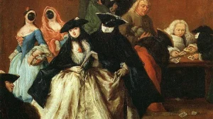 Old venetian masks. detail, Conversation between Baute Masks, by Pietro Longhi (1701-1785)