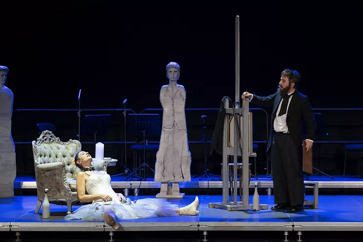 Οι δυο επί σκηνής ηθοποιοί, ο Θανάσης Τσαλταμπάσης και η Βερόνικα Αργέντη κράτησαν το βλέμμα των θεατών καρφωμένο πάνω τους. Εκείνος με το αργό, χαλαρό, μετέωρο βήμα του, να ζωγραφίζει, να πέφτει, να σηκώνεται, σαν να τσαλαβουτάει στον χρόνο, να παραπατάει με το σώμα σε συστροφή μέσα στα φαρδιά του παντελόνια … Εκείνη σε διαρκή μεταμορφωτική ροή- να μπαίνει στο μεδούλι των ρόλων∙ άσεμνη και σεμνή, συνεσταλμένη και προκλητική, με τη μια γάμπα στο μπράτσο της πολυθρόνας, με το γέλιο της «δουλειάς», με την κρυμμένη αλήθεια στους φραμπαλάδες της, στις δαντέλες της, στα φορώ της -μάνα, μοντέλο, χορεύτρια, σπιτονοικοκυρά- ανάλαφρη και βαριά, γυναίκα πάντα βασανισμένη …