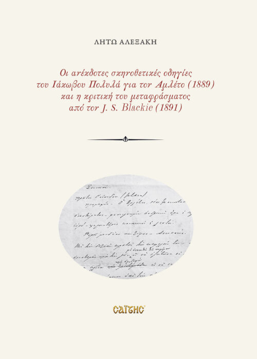 Οι εκδόσεις αγνώστων και αδημοσίευτων κειμένων, γραμμένων από προσωπικότητες οι οποίες διαμόρφωσαν τις στέρεες βάσεις για αυτό που αποκαλούμε νεοελληνική γλώσσα και λογοτεχνία, συνιστούν πάντοτε γεγονότα αξιοπρόσεκτα. Πολλώ δε μάλλον όταν οι εκδόσεις αυτές είναι καρποί της έρευνας μελετητών που θα λέγαμε πως έχουν αφιερώσει τη ζωή τους στην εκ νέου ανάδειξη των προσωπικοτήτων αυτών. Τέτοια περίπτωση λοιπόν αποτελεί και η μονογραφία «Οι ανέκδοτες σκηνοθετικές οδηγίες του Ιάκωβου Πολυλά για τον Αμλέτο (1889) και η κριτική του μεταφράσματος από τον J.S. Blackie (1891)» (εκδ. Σαΐτης, 2020) της Λητούς Αλεξάκη.