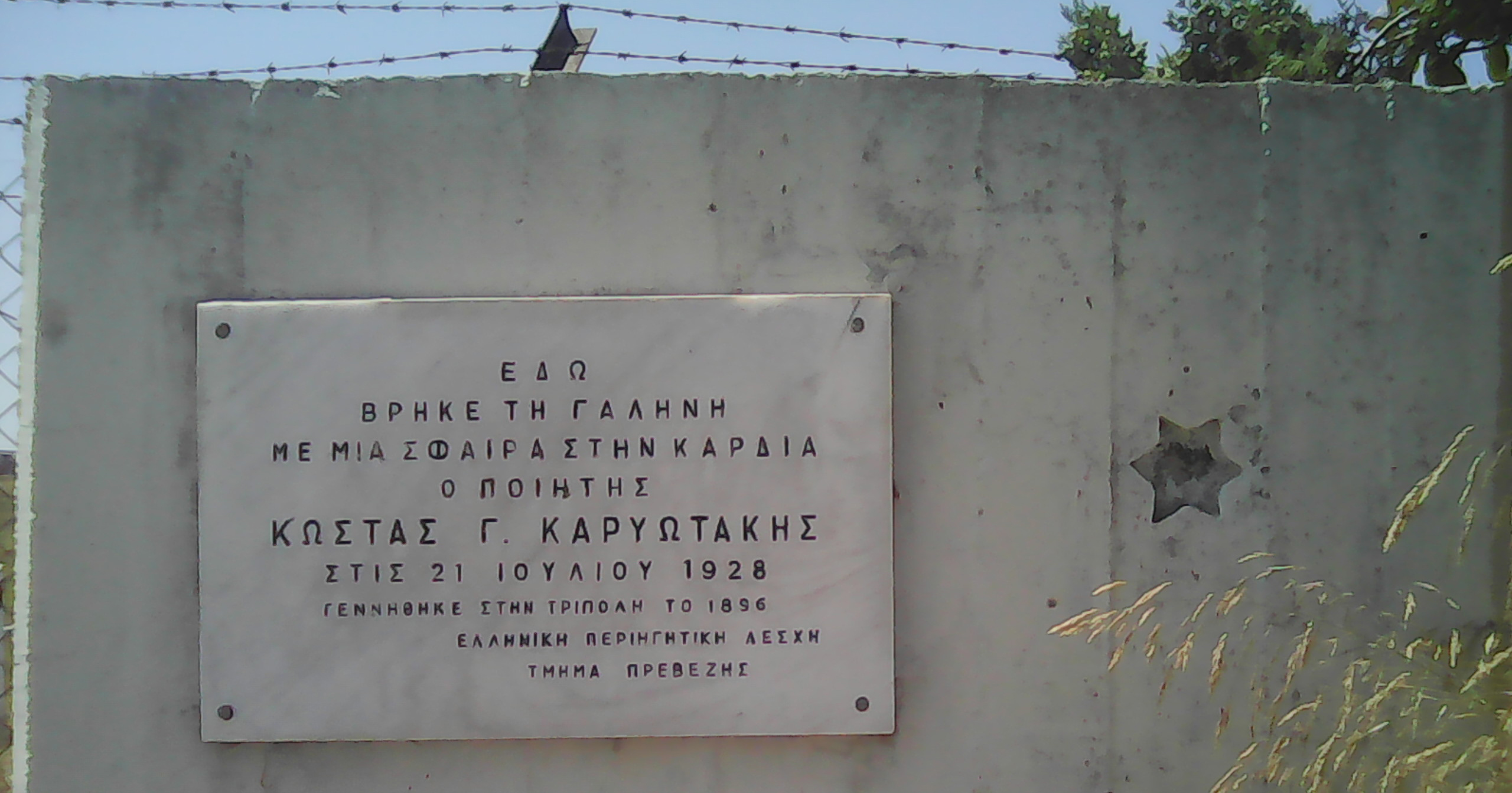 Εκεί όμως που πραγματικά ανατρίχιασα ήταν στο σημείο της αυτοκτονίας του. Εκεί, στη θέση Βαθύ στη Μαργαρώνα όπου βρίσκεται σήμερα το στρατόπεδο των καυσίμων της 8ης Μεραρχίας Πεζικού, η λευκή λιτή πινακίδα γράφει: «Εδώ, στις 21 Ιουλίου 1928, βρήκε τη γαλήνη με μια σφαίρα στην καρδιά ο ποιητής Κώστας Καρυωτάκης»… Κοίταξα γύρω μου. Εξακολουθούσαν να υπάρχουν ευκάλυπτοι. Η θάλασσα ήταν εκεί, γαλήνια. Έλειπε το εργοστάσιο σαπωνοποιίας που υπήρχε τότε στην περιοχή, σύμφωνα με όσα μας είπαν οι τοπικοί μας ξεναγοί και νέοι φίλοι, Μιχάλης και Ελένη[10].