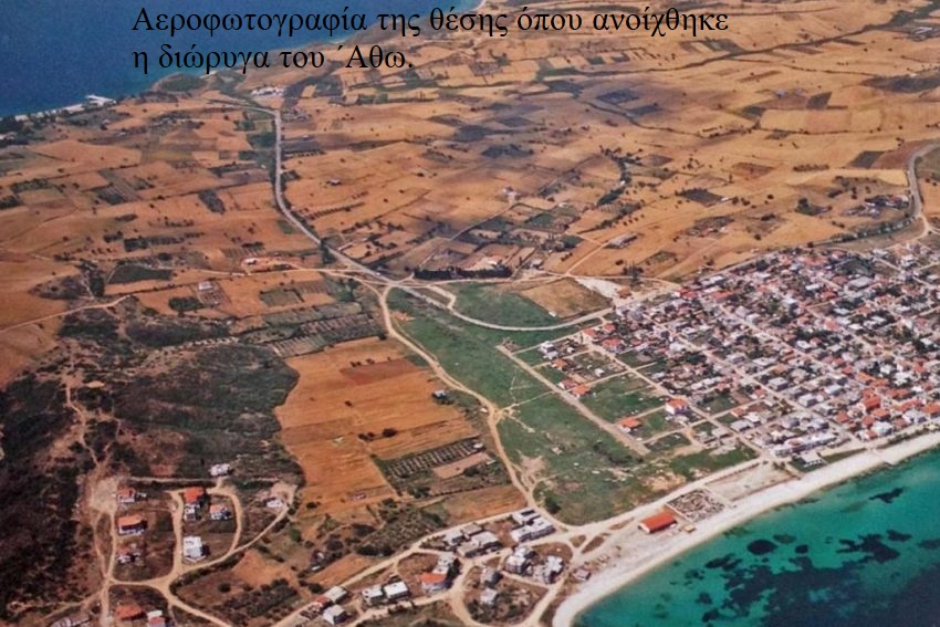 Αυτές είναι οι πόλεις που βρίσκονται στον ΄Αθω· και οι βάρβαροι έσκαβαν με τον εξής τρόπο, αφού μοίρασαν τον χώρο κατά έθνη. Πρώτα τράβηξαν μιαν ευθεία γραμμή στην πόλη Σάνη και, καθώς η διώρυγα βάθαινε, άλλοι έσκαβαν μένοντας στα πιο χαμηλά σημεία, ενώ άλλοι έδιναν το χώμα που συνεχώς έβγαινε από το σκάψιμο σε άλλους που στέκονταν ψηλότερα πάνω σε σκαλωσιές, κι αυτοί πάλι το έπαιρναν και το έδιναν σε άλλους, έως ότου έφθαναν σ’ εκείνους που ήταν στην κορυφή· και αυτοί το μετέφεραν έξω και το πετούσαν. Τότε, στις θέσεις των άλλων εκτός των Φοινίκων, οι απόκρημνες πλευρές του ορύγματος γκρεμίζονταν και διπλασίαζαν τον απαιτούμενο κόπο· επειδή δηλαδή έδιναν τις ίδιες διαστάσεις και στο πάνω και στο κάτω άνοιγμα, ήταν επόμενο να τους συμβεί κάτι τέτοιο. Όμως οι Φοίνικες και στα άλλα έργα τους δείχνουν την ικανότητά τους και την έδειξαν και σ’ εκείνο το έργο. Αφού δηλαδή πήραν με κλήρο το τμήμα που τους αναλογούσε, έσκαβαν το πάνω άνοιγμα της διώρυγας κάνοντάς το διπλάσιο απ’ όσο έπρεπε να γίνει η ίδια η διώρυγα, και όσο προχωρούσε το έργο όλο και περιόριζαν το πλάτος. ΄Εφθασαν λοιπόν στο κάτω μέρος, και το εκσκαφικό τους έργο ήταν ίσιο στο πλάτος με των άλλων. […]