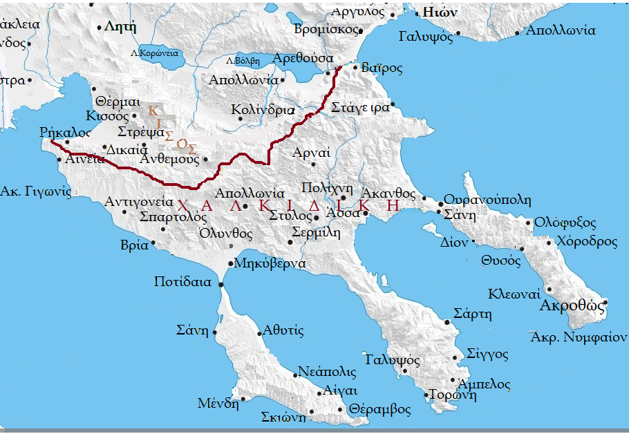 Στον ισθμό αυτόν στον οποίο απολήγει ο ΄Αθως υπάρχει μία ελληνική πόλη, η Σάνη, και άλλες στην περιοχή της, χτισμένες στο εσωτερικό τού ΄Αθω, τις οποίες τότε ο Πέρσης είχε πάρει φόρα να τις κάνει νησιωτικές από στεριανές. Ετούτες είναι: το Δίον, η Ολόφυξος, το Ακρόθωον, η Θύσσος, οι Κλεωνές.