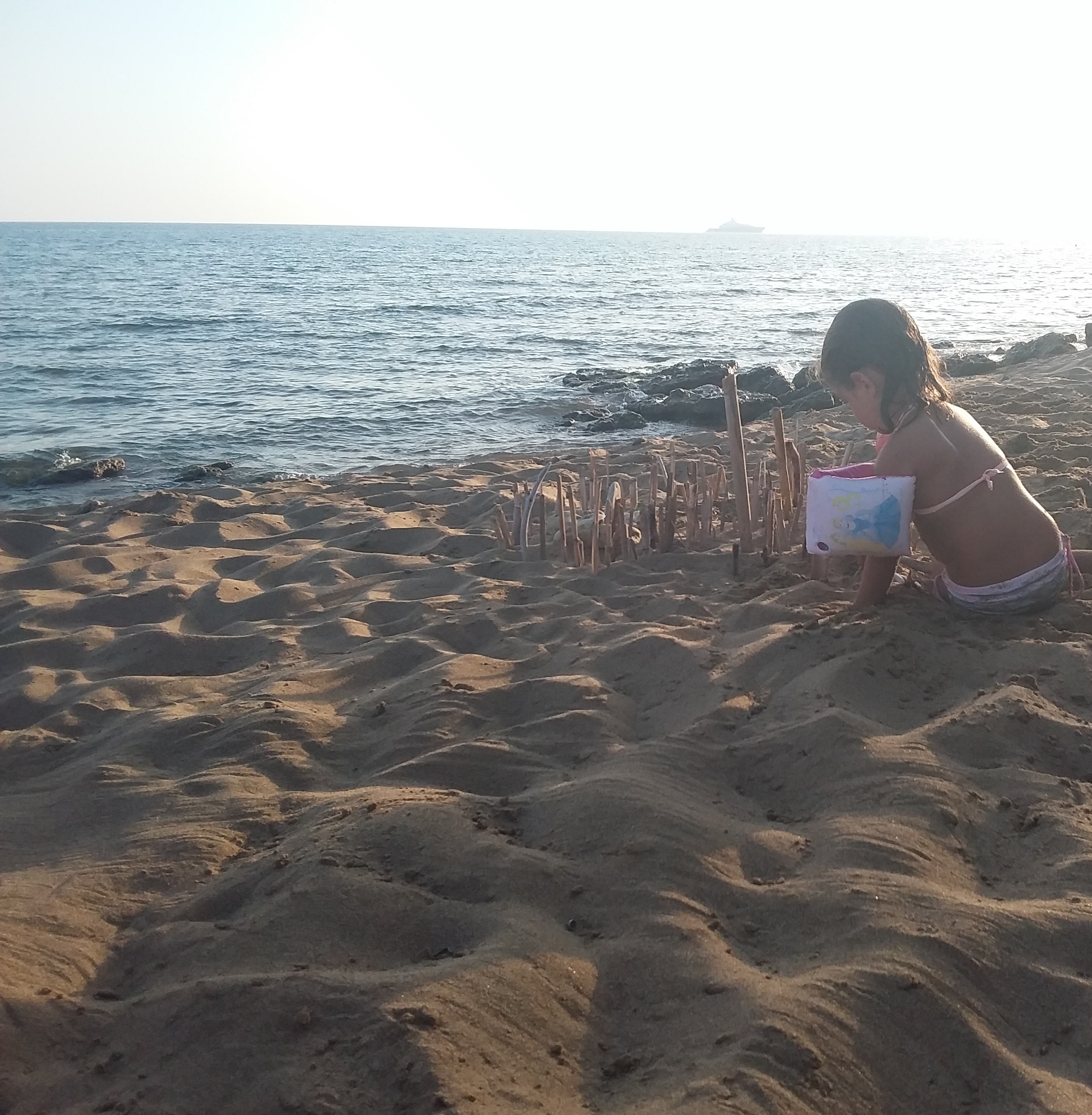 Το κοριτσάκι κάθεται στην άμμο. Είναι απόγευμα. Το κορμάκι του σκυφτό, φοράει τα φουσκωτά μπρατσάκια, και μοιάζει πολύ σοβαρά απασχολημένο. Μπροστά του, σε μια περίπου κυκλική επιφάνεια, στήνει κατακόρυφα κομμάτια από καλάμια. Άλλα ψηλότερα άλλα κοντύτερα, άλλα ξερά άλλα πιο πράσινα άλλα χοντρά και άλλα όχι τόσο. Σε ένα σημείο, ανάμεσα στα όρθια καλάμια, έχει τοποθετήσει μερικές κροκάλες, όχι πολλές, πέντε ή έξι μικρές και μεγαλύτερες, και ανάμεσά τους λίγη πρασινάδα. Διάταξη ακανόνιστη αλλά αρμονική. Χωρίς συμμετρία αλλά με χάρη. Καθώς ο ήλιος πέφτει λοξά, οι σκιές από τα ανισοϋψή καλάμια πάνω στην κυματιστή επιφάνεια της άμμου δημιουργούν μίαν εικόνα, όπου η φύση και η ανθρώπινη παρέμβαση δένουν αρμονικά. Σαν να ήταν πάντα εκεί.