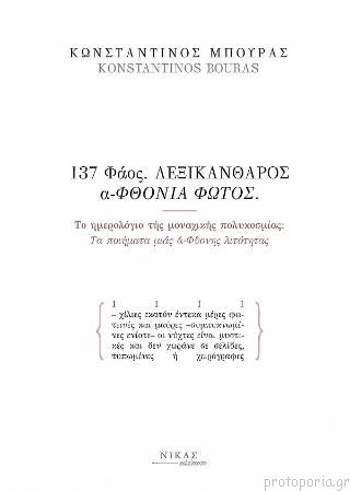 Λεξικάνθαρος Αφθονία Φωτός, Φθινόπωρο, Τριακόσιες εξήντα πέντε προσοχές για το Αχανές, εκατόν έντεκα στρογγυλά ποιήματα, τριάντα τρεις δεήσεις προς τον Πρωταρχικόν Δημιουργόν απάντων, είκοσι και πέντε “προσευχές” ταπεινών και αδύναμων όντων (το καθένα προς τον δικό του “θεό”), μαζί με εικοσιπέντε ποιήματα πατριδογνωσίας που ξεναγούν τον αναγνώστη στις ενεργειακές πύλες τής Ελλάδας, τριακόσια εξήντα πέντε ημερολογιακά ποιήματα, ακόμα έντεκα “κρυμμένα” και έντεκα «παροντικές πρώτες βοήθειες ποιητικές», σαράντα τέσσερα «καταληκτικά» ποιήματα, το «εικονοστάσιον επωνύμων φίλων», καθώς και μεταφρασμένα ποιήματα τού Κωνσταντίνου Μπούρα σε διάφορες γλώσσες από φίλες εθελόντριες και φίλους καλοπροαίρετους, συν 24 χάϊ-κού τής διασποράς, συν 31 παραλειπόμενα ποιήματα, 112 επείγουσες κλήσεις, μία ελεύθερη δημιουργική ανάπλαση από τον Κωνσταντίνο Μπούρα τού αρχαιότερου ερωτικού ποιήματος από τη Σουμερία τής τρίτης δυναστείας, εν έτει 2037 π.Χ., κι επιπροσθέτως, 25 αγάπες, ένας κάποιος ισολογισμός ζωής κι ένας (απαραίτητος ή περιττός) επίλογος….ααα, ξέχασα: συν 47 επίμετρα, επιπροσθέτως 33 ΜΥΣΤΙΚΑ, ΑΛΛΑ ΌΧΙ ΚΡΥΜΜΕΝΑ…, και 56 ποιήματα ΤΟ ΛΑΚΩΝΙΖΕΙΝ… κι ένας δεύτερος επίλογος… συν μία κατακλείδα, συν ένα ποιητικό δοκίμιο με φιλοσοφικές απολήξεις, συν 78 στίχοι, Ανάβυσσος εν τέλει…και Πολυδιαστασιακός εαυτός…κρυφές γραφές, συν έκστασις, συν Ποίηση, καθώς και Παλαμάς, ψυχή τρισεύγενη…. ένα ποίημα για τον Ευριπίδη επιπροσθέτως, καθώς και τα καταληκτικά «Πρώτο φθινόπωρο ελευθερίας», «Ο ζωγράφος Αλέξανδρος Λιάπης», «Καθημερινά παράδοξα…», «Ευτυχία είναι για τον Κωνσταντίνο Μπούρα» και «Άνθρωποι και κοάλα κραυγάζουν», παραλειπόμενα, Φυσική Ιερά Γεωμετρία. Θεσσαλονίκη ποιητομάνα, 888, 14 χαϊκού τής υπομονής, Ξένιος Ζευς και Δημοκρατία, Επιτύμβιο, Αριστεία, Διαθήκη, Αντιθέσεις, Πρόσφυγες είμαστε όλοι στα μάτια Τού Θεού, Άρφας-Ορφεύς-Αρφαρά, Λοιμός, Λιμός, Καταποντισμός…, Πανούκλα και Χολέρα… κορονοϊός και άλλα παράσιτα, ποίημα ποιητικής για το diastixo, Θάλασσα παντοτινή κολυμβήθρα, Εγκλεισμού παράπλευρες ωφέλειες, Ποιήματα που θα ήθελα να γράψω, Έξοδος προσωρινή, Έξοδος κανονική, Το χελιδόνι που έπεσε από τον ουρανό, Χριστόφορος Άγγελος Χριστοφής, Κβαντικός εναγκαλισμός, “Μην μου κόβετε την ανάσα!!!”, Ηρώδειο – δύο πανσέληνοι τον Αύγουστο του σωτηρίου έτους 2020, Ένα ποίημα για το καλοκαίρι Γιώργο Σεφέρη, Κυκλικός χρόνος, Αρκαδία, Έρως θεός, Στο κοχύλι των αρχαίων θεάτρων, Ο ποιητής επιστρέφει πάντα, Αρχαίο θέατρο Μεγαλόπολης, Συγκοινωνούντα δοχεία της κλεψύδρας, Η τρίτη προσπάθεια, Τήνος, Δήλος, Ανά-μυθοποίησις, Ίασις, Μεγαλόχαρη, Περί γραμματικής, Περί Ποιητικής, Περί Κάλλους και Ειδής, Ο Θάνατος, Εγκράτεια, Κέρος, Ελληνικό καλοκαίρι, Μέγας Μύστης, Το Ακτινοβόλο Αστέρι, Σελήνη, Ήλιος, Κρίση, Ο Κόσμος, Ο Τρελός, Το Μηδ-Έν, Το πατρικό σπίτι το μίσησα, Κερδισμένος χρόνος, «Μην την εγκαταλείπεις την ποίηση…», Ακακίας Κενοτάφιον, Τετράλογος μιας ζωής, Ο Δημήτρης Παπαδημητρίου στο Σούνιο, Επιρροή, Πρώην φίλοι, πρώην συγγενείς, Η θλίψη, Εμβάθυνσις, Αντί-Οδυσσέας, Νέμεσις Ιχναία, Αδράστεια, Ραμνουσία, Μελιπαθής Πρωτο(σ)παθισμός, Σύμπαντα και Κόσμοι, Υμηττός ο “Τρελλός”, Γιάννης Στεφανάκις, Έν-τις, Ελευθερία πάση θυσία…, Σαν επωδός διαλογιστική, Η θεωρία τού Παντός: Φάος-φαΐ, Τελευταία επιθυμία, Κοίλη Οδός, Θεουργία, Μήδεια – 12 το μεσημέρι/μεσάνυχτα – Χειμερινό Η