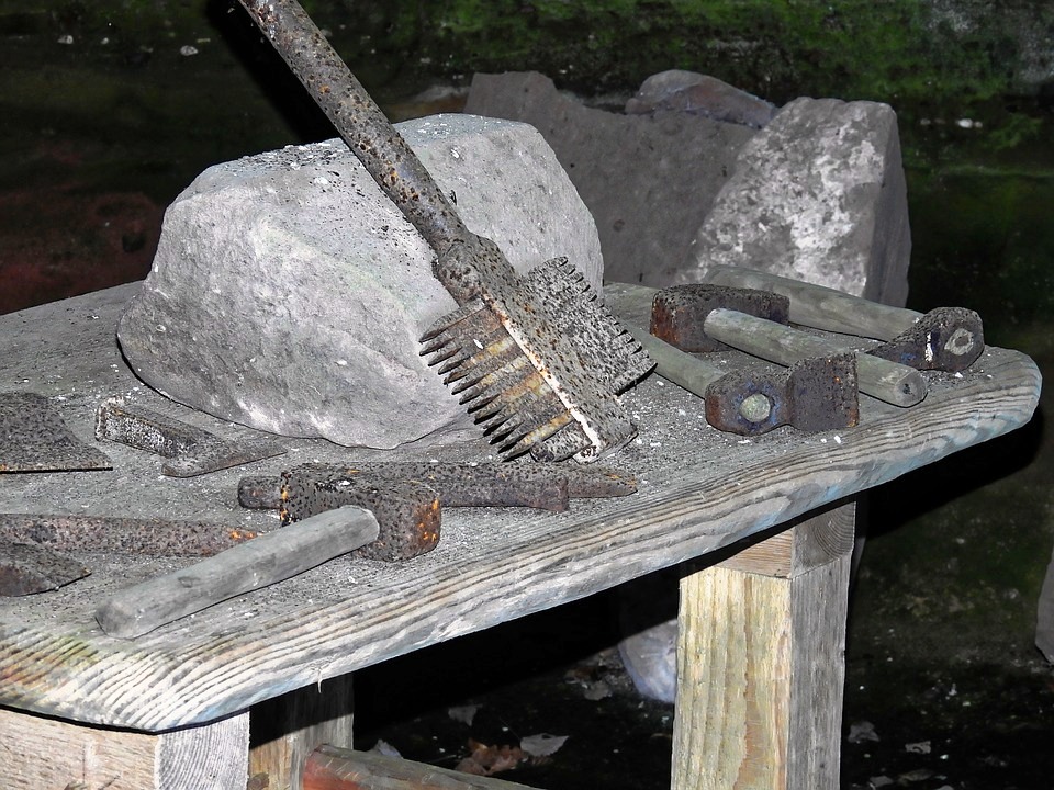 Όλα του τα ανάχρεια ήτανε μέσα κει. Κρεμασμένα, πάνω από τον βαρύ πάγκο, κάθε είδους καλέμια, βελόνια, ματρακάδες, σμίλες, τρυπάνια, ράσπες. Τριγύρω σκόρπια κομμάτια μάρμαρα και πέτρες. Στο βάθος το διαμαντοπρίονο, το πιο βαρύ εργαλείο, για να σχίζει τις μαρμαρόπετρες.