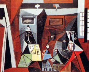 Σίγουρα εκεί πάνω στη στιγμή που χρειάστηκε ο καλλιτέχνης για να κοιτάξει από μιαν απόσταση το αρχινισμένο έργο και να το εγκιβωτίσει με τα σύμβολα και τους υπαινιγμούς του να βρίσκεται όλη η σημασία του, το νόημά του. Σ’ αυτή τη στιγμή πάνω αιχμαλωτίστηκε η σκέψη του νεαρού Πικάσο χρόνια ολόκληρα για να φτάσει ηλικιωμένος πια στα 1957-έξι περίπου δεκαετίες αργότερα στα 76 του χρόνια- να φιλοτεχνήσει τις περισσότερες [58 τον αριθμό] παραλλαγές που διασκευάζουν, αναλύουν και επανερμηνεύουν ένα τόσο δυσερμήνευτο – σχεδόν ερμητικό-έργο. Ο Πικάσο άλλαξε την κατακόρυφη διάταξη σε οριζόντια, άνοιξε τα κλειστά παράθυρα του Βελάσκεθ και φώτισε κι άλλο την παράσταση του πίνακα ανάβοντας το δικό του φως. Δούλεψε με μανία παράφορη πάνω στον πίνακα μεγεθύνοντας τον Βελάσκεθ, επανατοποθέτησε τα πρόσωπα κάποιες φιγούρες τις απλοποίησε μετατρέποντάς τις σε σιλουέτες που έρχονται σε αντίθεση με την φορτωμένη μπαρόκ σκηνή του πρωτοτύπου. Πολλαπλασίασε τον πίνακα αλλά δεν πρόσβαλλε τη δομή και την υπόστασή του.