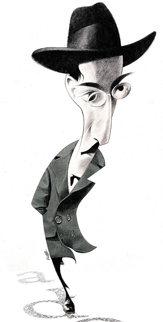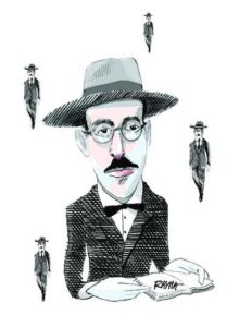 Αυτή η μοναχική λοιπόν φιγούρα που περιφερόταν ανά τας ρίμας και τας οδούς της Λισαβόνας μετρίου αναστήματος, φορώντας κοστούμι και παπιγιόν κι ένα μικρό μουστάκι, με δυο μεγάλα μάτια κρυμμένα πίσω από τα στρογγυλά του γυαλιά-θαρρείς και γεννήθηκε μαζί τους- δεν εμφανιζόταν ποτέ ασκεπής. Δεν ξέρω αν οι ετερώνυμοι- καθόλου πανομοιότυποι με τον δημιουργό τους-ήταν ασκεπείς ή φορούσαν καπέλο. Τείνω να πιστεύω πως ισχύει το πρώτο και μάλλον δεν ήταν το μοναδικό σημείο διαφοροποίησής τους απέναντί του, πέρα από το έργο τους και το βιογραφικό τους.
