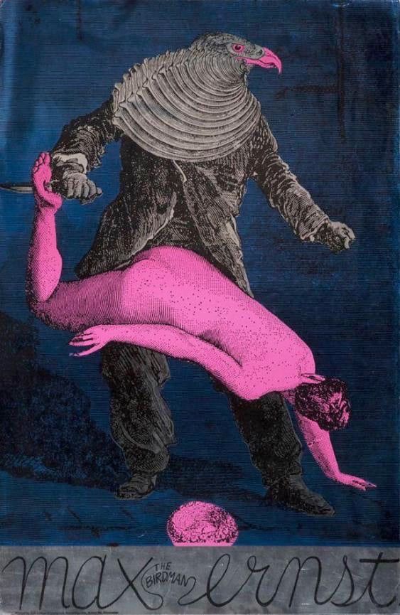 Ο Μαξ Έρνστ [1891-1976] γερμανικής καταγωγής πρωτοπήγε στο Παρίσι σε ηλικία 22 ετών το 1913, ενώ το 1958 πήρε την γαλλική υπηκοότητα αν και πολέμησε τους Γάλλους στον Α’ Παγκόσμιο Πόλεμο. Δε σπούδασε ζωγραφική αλλά φιλοσοφία και ψυχολογία στη Βόννη. Γνωρίστηκε με τον Άουγκουστ Μάκε, τον Χανς Άρπ, τον Πικάσο, τον Κλέε, τον Ντε Κίρικο. Ήταν επικεφαλής του Νταντά Κολωνίας με το ψευδώνυμο Ντάνταμαξ. Όντας έξω από το καλλιτεχνικό κατεστημένο ενδιαφέρθηκε ιδιαίτερα για την τέχνη των ψυχωσικών, τους οποίους επισκεπτόταν συχνά και συνομιλούσε μαζί τους. Αμέλησε όμως την ακαδημαϊκή του σταδιοδρομία και την εγκατέλειψε. Εγκαταστάθηκε οριστικά στο Παρίσι το 1922 και εντάχθηκε αργότερα στο σουρεαλιστικό κίνημα στο οποίο συνεισέφερε, εκτός των άλλων, το φροτάζ που ο ίδιος επινόησε, μια τεχνική που το αποτέλεσμά της είναι το ‘’αντικειμενικά τυχαίο’’ που ενεργοποιεί τη φαντασία του καλλιτέχνη. Δημιούργησε και τη «νουβέλα με κολάζ» που πλησιάζει τη φόρμα του κόμικ. Και παρόλο που εγκατέλειψε το σουρεαλιστικό κίνημα το 1938 συνέχισε την πορεία του χωρίς να αλλάξει το ύφος του και όταν παντρεύτηκε την Πέγκυ Γκούγκενχαϊμ και μετανάστευσε στην Αμερική συνδέθηκε ξανά στενά με τον Μπρετόν. Υπήρξε ιδιαίτερα ερωτικός άνθρωπος και καλλιτέχνης. Για ένα διάστημα αποτέλεσαν τρίο με την Γκαλά και τον Ελυάρ, ενώ μετά το σοβαρό ψυχωσικό επεισόδιο που παρουσίασε η πρώτη σύντροφός του Λεονόρα Κάρινγκτον με την οποία είχε μια θυελλώδη ερωτική σχέση, που εκδηλώθηκε όταν την εγκατέλειψε και χρειάστηκε να εγκλειστεί σε ψυχιατρική κλινική, έκανε δεσμό με την Λεονόρ Φινί μια ζωγράφο με παραισθητικό σεξουαλικό στυλ, αν και παρέμεινε στο περιθώριο του κινήματος αντίθετα με την Δωροθέα Τάννινγκ που γνώρισε το σουρεαλισμό από τον Έρνστ στην Αμερική και κατέκτησε κεντρική θέση σ’ αυτόν.