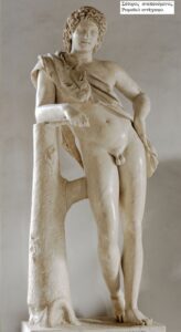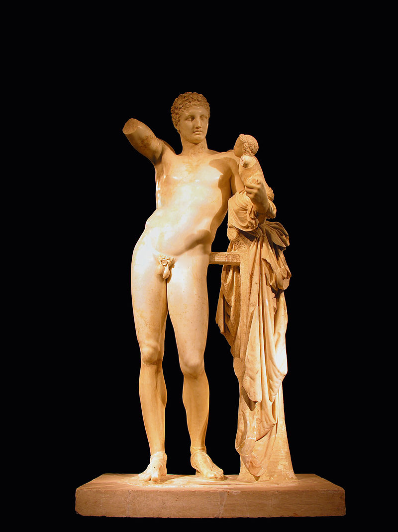 3)Ο Πραξιτέλης, ο μεγάλος Αθηναίος γλύπτης, άκμασε στο δεύτερο και τρίτο τέταρτο του 4ου αι. π.Χ. Αναδείχθηκε κυρίως στην επεξεργασία του μαρμάρου και εξέφρασε με μοναδικό τρόπο την αισθητική ομορφιά, τη χάρη και την τρυφερότητα. Χαρακτηριστικά της τέχνης του είναι οι λεπτοφυείς μορφές και η απόδοση της απαλής επιδερμίδας με τις αβρές μεταβάσεις από τη μια επιφάνεια στην άλλη, δίνοντας την αίσθηση θερμής ζωντανής σάρκας· επίσης, η λυγισμένη στάση του νεανικού κορμιού που γέρνει με χάρη, καθώς στηρίζεται σε ένα πρόσθετο στήριγμα, ώστε να κυματίζει ο άξονας του σώματος. Την αρμονία και το κάλλος της μορφής κορύφωνε η γοητευτική, δύσκολα περιγραφόμενη έκφραση με το αόριστο μειδίαμα, « […] καὶ τῶν ὀφθαλμῶν τὸ ὑγρὸν ἅμα τῷ φαιδρῷ καὶ κεχαρισμένῳ […] » ([…] και την υγρασία, την ηδυπάθεια των ματιών μαζί με τη χαρμονή και την ευφροσύνη […]),κατά την έκφραση του Λουκιανού. Όλα τα παραπάνω χαρακτηριστικά της υψηλής πραξιτέλειας τέχνης μάς καθηλώνουν αντικρίζοντάς τα αποτυπωμένα στο περίφημο άγαλμα του Ερμή με τον μικρό Διόνυσο που βρίσκεται στην Ολυμπία, το μόνο έργο τού Πραξιτέλη το οποίο έχει σωθεί. Από την αρχαία παράδοση έχουμε αναφορές πολλών έργων του ⸺ τα περισσότερα αγάλματα θεών ⸺ για ορισμένα από τα οποία υπάρχουν ρωμαϊκά αντίγραφα, όπως ο Απόλλων Σαυροκτόνος· ο Λύκειος Απόλλων· ο περίφημος μαρμάρινος ΄Ερως των Θεσπιών, που αφιερώθηκε στον εκεί ναό του θεού από την εταίρα Φρύνη, την καταγόμενη από τις Θεσπιές, στην οποία έδωσε το άγαλμα ο Πραξιτέλης ως δώρο αγάπης, και παραδίδεται ότι μετέβαιναν πλήθη κόσμου στην πόλη μόνο και μόνο για να θαυμάσουν αυτό το άγαλμα· ποικίλοι Σάτυροι κ. ά.