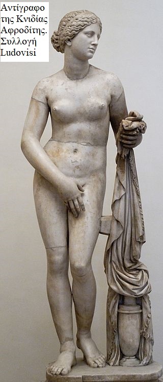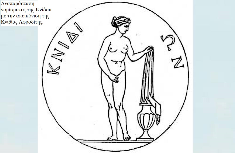 5)Ο τύπος της Κνιδίας Αφροδίτης ταυτίστηκε από την απεικόνιση του αγάλματος σε ρωμαϊκά νομίσματα της Κνίδου. Η θεά εικονίζεται γυμνή τη στιγμή που ετοιμάζεται να πάρει το λουτρό της. Με το αριστερό χέρι αποθέτει το ένδυμά της πάνω σε μια υδρία, ενώ το δεξιό καλύπτει την ήβη της. Την Αφροδίτη της Κνίδου εκτός από την τέλεια ομορφιά τη χαρακτηρίζει και η καινοτομία, καθότι ο Πραξιτέλης ήταν ο πρώτος που τόλμησε να φιλοτεχνήσει γυμνό άγαλμα θεάς και μάλιστα λατρευτικό. Μέχρι τότε η γυμνότητα στα γυναικεία αγάλματα μεγάλης κλίμακας ήταν άγνωστη, όμως έκτοτε καθιερώθηκε και έγινε συνήθεια. Με τη γύμνωση του αγάλματος της θεάς του έρωτα, ο Πραξιτέλης ύμνησε το καλλίγραμμο γυναικείο κορμί και τόνισε το αισθησιακό στοιχείο της θεάς εισάγοντάς το στη μνημειακή τέχνη. Αξίζει να σημειώσουμε ότι, καταπώς λέγεται, ο Πραξιτέλης χρησιμοποίησε ως μοντέλο την ερωτική του σύντροφο, τη Φρύνη.